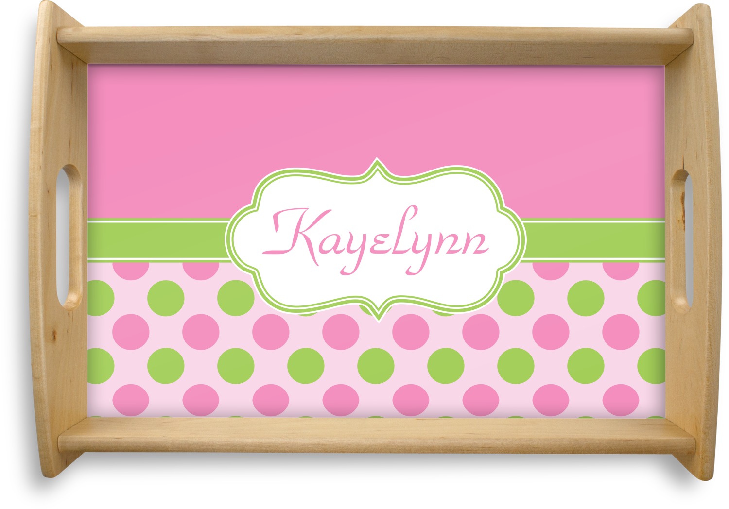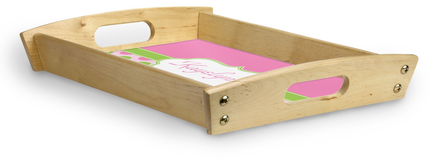 This serving tray with handles features square edges and two rounded sides, creating a very modern look. Each side is fabricated from a beautifully cut, natural wood. The bottom of the interior of the tray displays your customized design in bright, vibrant color. The tray is sold in both a black color and a natural wood look. Each variation of the wood serving tray has two sizes: Small, which is 14" x 10" x 2.25", and Large, which is 19.5" x 13.5" x 2.75".