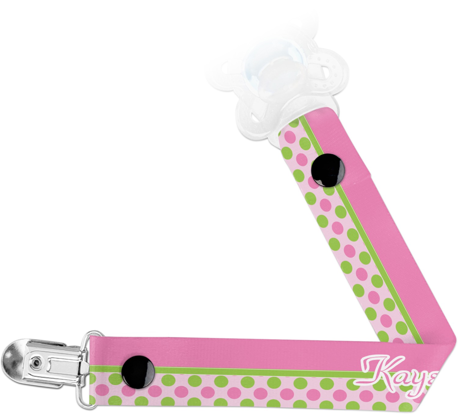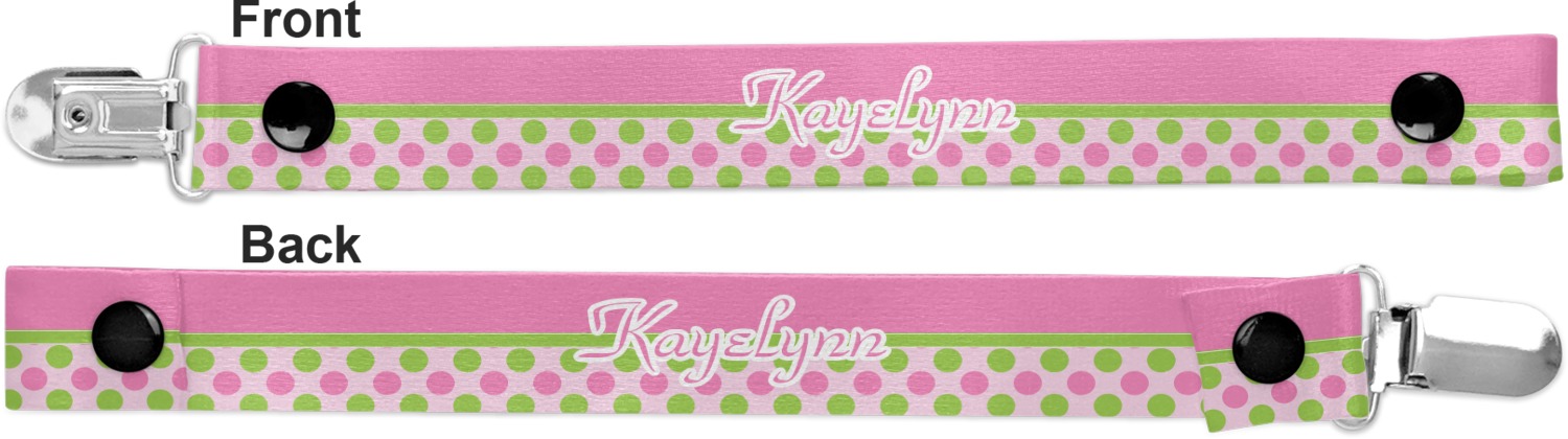 This personalized pacifier clip is the ideal size and measures at approximately 7.5 inches in length, when either end is snapped closed. On one end, you'll find a snap button. This button of your baby's pacifier holder is what can be attached to their pacifier to hold is securely in place. Simply open the snap, slip it through the pacifier opening, and snap it back into place. On the opposite end of this baby pacifier holder, you'll find a metal clip that can secure to a baby's collar or sleeve. This clip ensures that the strap stays in place, and that your baby's pacifier is always on hand.