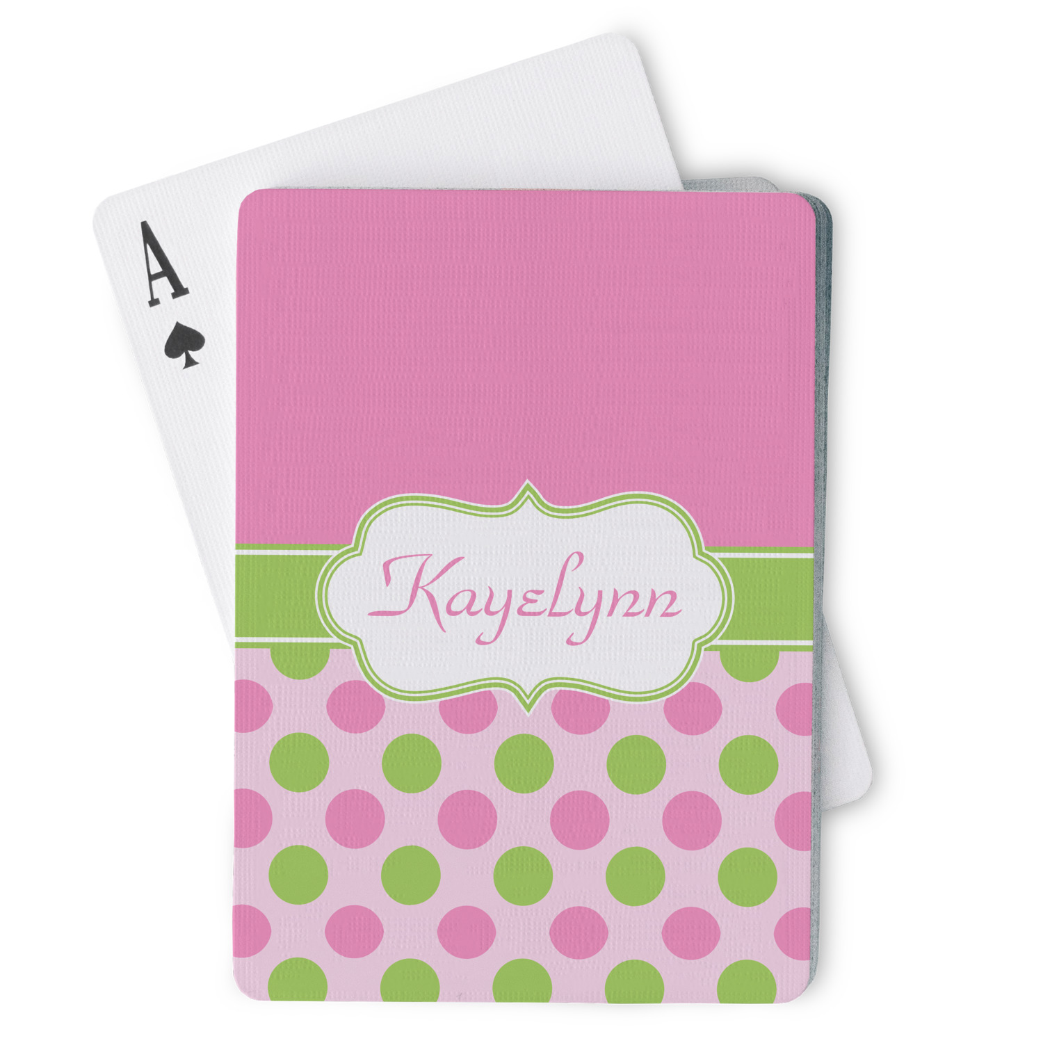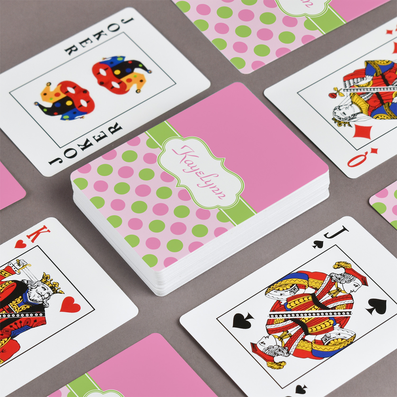 The customization / personalization is printed on the back side. The playing cards have a low gloss coating on both sides. The cards are packaged in a clear plastic box.