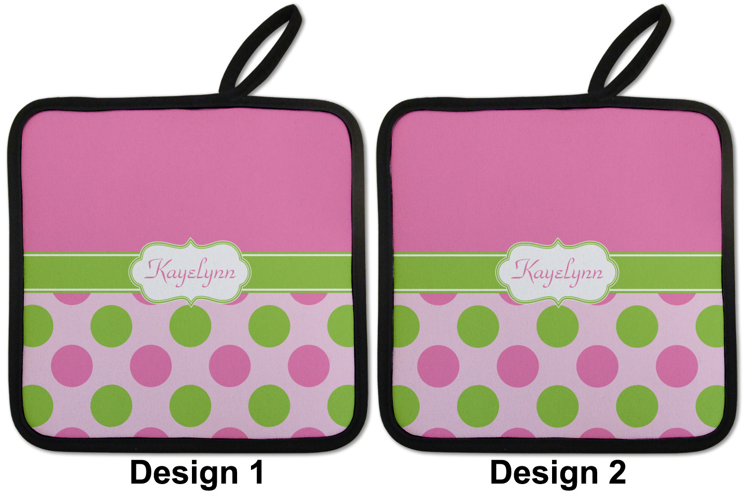 Our personalized pot holders feature a neoprene front that displays your personalization in vibrant colors. The backing of the hot pot holder is rubberized; the textured backing allows you to have a great grip when using this custom pot holder. The two materials are joined with a sleek, black trim, and the holder also includes an attached loop for hanging and storage. The pot holder is approximately 8.75 inches by 8.75 inches and 0.25 inches tall, while the fabric loop is 2.5 inches long. You can purchase a kitchen pot holder by itself or as a set of 2. We also offer a set including one pot holder and one oven mitt.