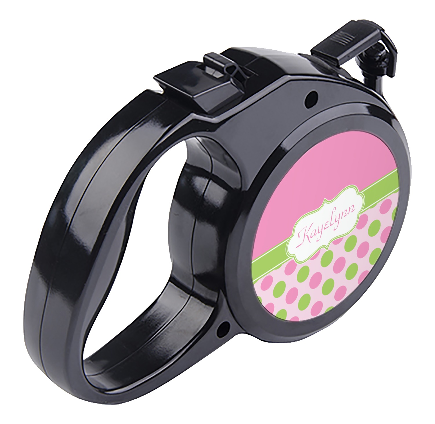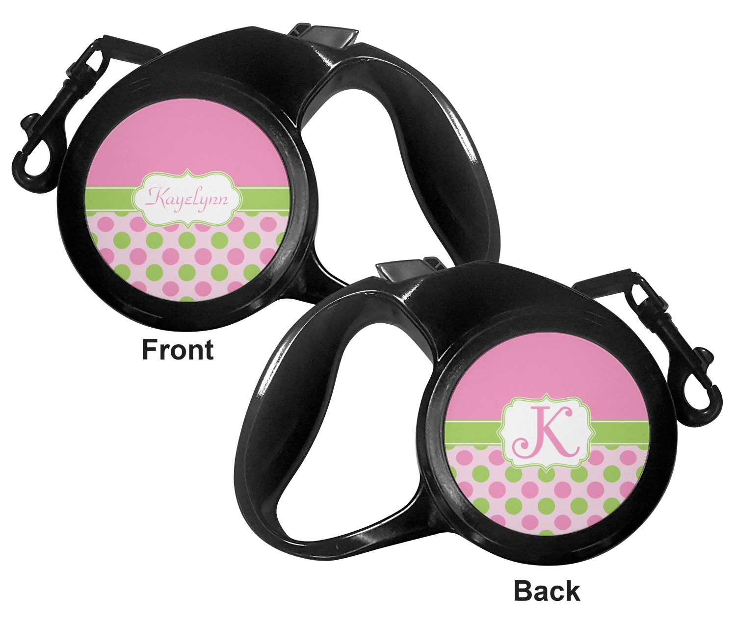 The leash's plastic handle is accommodating of your grip and displays your customization on both sides. The dog leash also features the traditional bolt snap clip, for easy fastening to your dog's collar. The leash and leash handle themselves are both black in color.