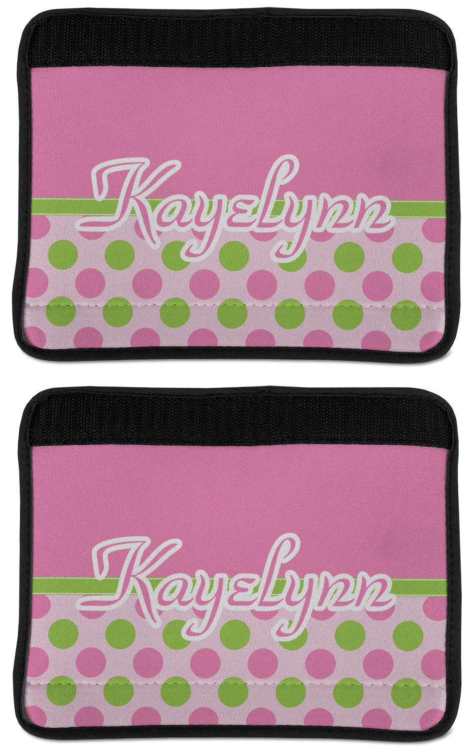Made from neoprene, our seat belt strap covers wrap around the belt itself and have a Velcro tab for easy attachment and closure. The belt's edges are trimmed with a black polyester for a secure finish. Each cover is 9.5 by 7 inches when open and 9.5 by 2.5 inches when closed. We print your personalized design on the face of the seat belt pad.