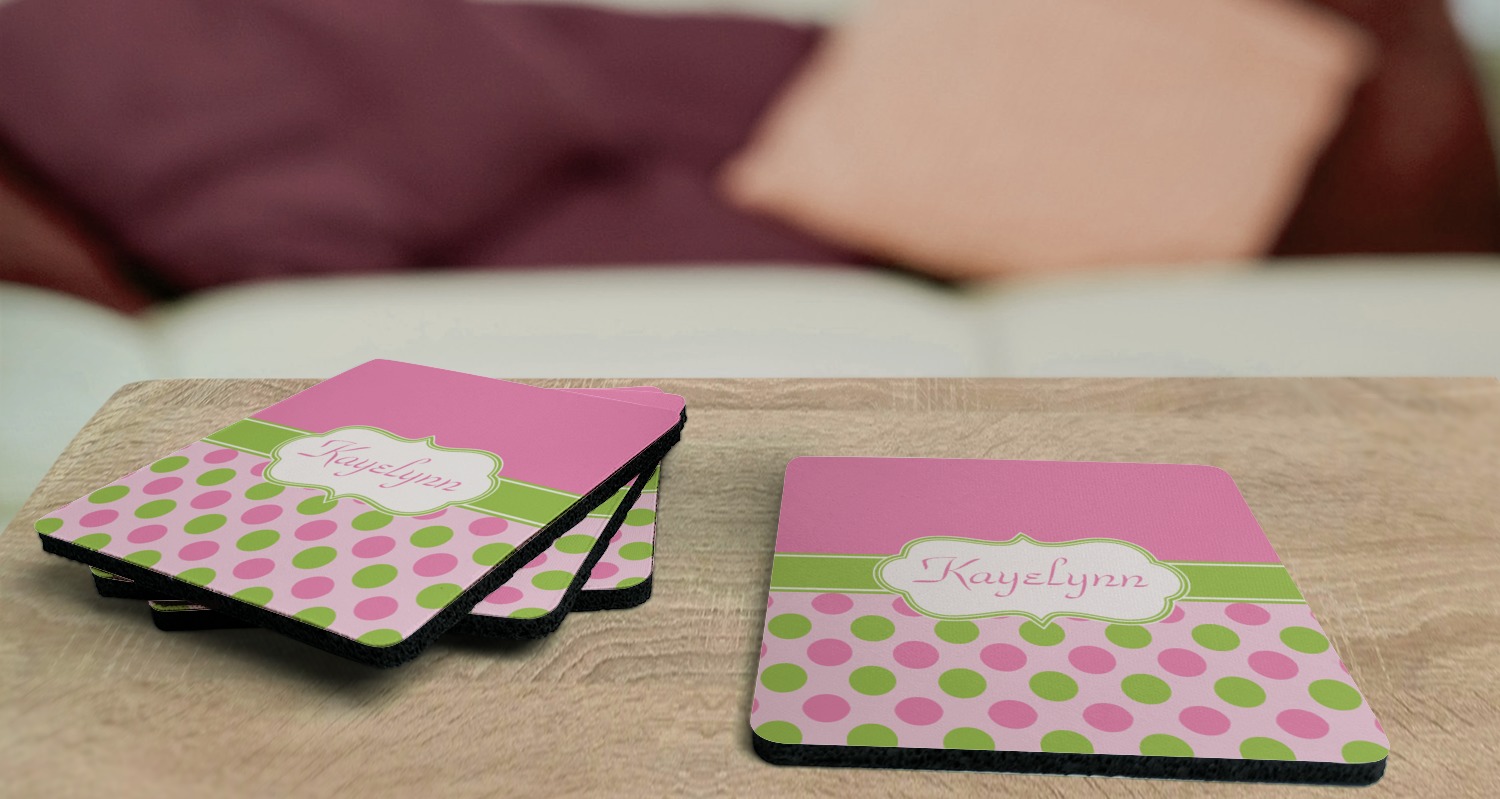 These drink coasters have a smooth, polyester top and a textured, rubber backing on its bottom. The non-slip rubber backing underneath works to keep any spills at bay. At 4 by 4 by 0.25 inches thick, these custom coasters are a suitable size for most drinkware. Your personalization is displayed atop the face of the cup coaster. We sell these rubber coasters in two different shapes: square and round. You can buy each shape as singulars or as a set of 4.