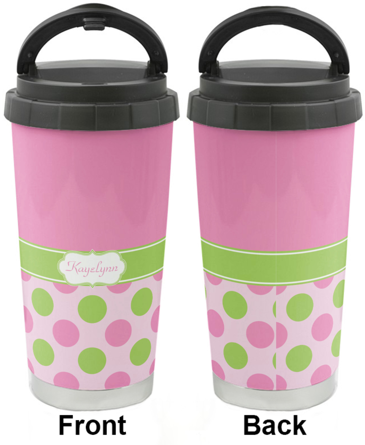 This sleek and tapered 16 oz stainless steel travel cup is a perfect fit in the hand. With the strip of visible stainless steel on the bottom, you'll be feeling classy!