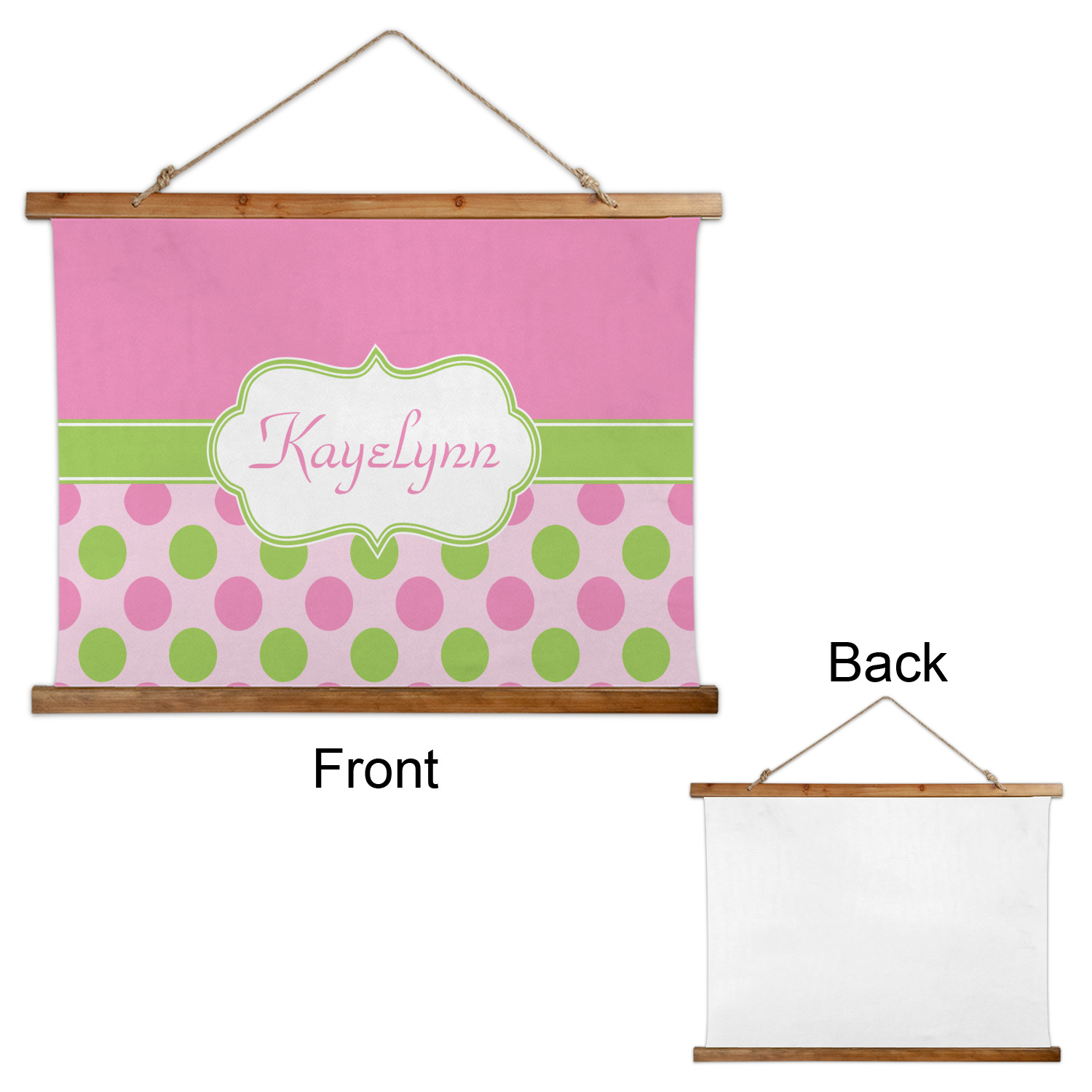Made in two different orientations - portrait or landscape - both are 26" x 36". Your design is printed on a high quality polyester fabric with hemmed edges. The wood on the top and bottom of the tapestry is 1.25" tall and 0.25" thick and there are two pieces on top and bottom which sandwich the fabric.
