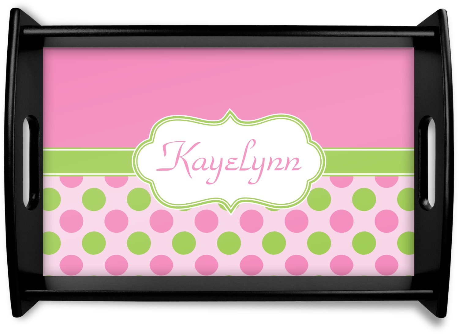 This serving tray with handles features square edges and two rounded sides, creating a very modern look. Each side is fabricated from a beautifully cut, natural wood. The bottom of the interior of the tray displays your customized design in bright, vibrant color. The tray is sold in both a black color and a natural wood look. Each variation of the wood serving tray has two sizes: Small, which is 14" x 10" x 2.25", and Large, which is 19.5" x 13.5" x 2.75".
