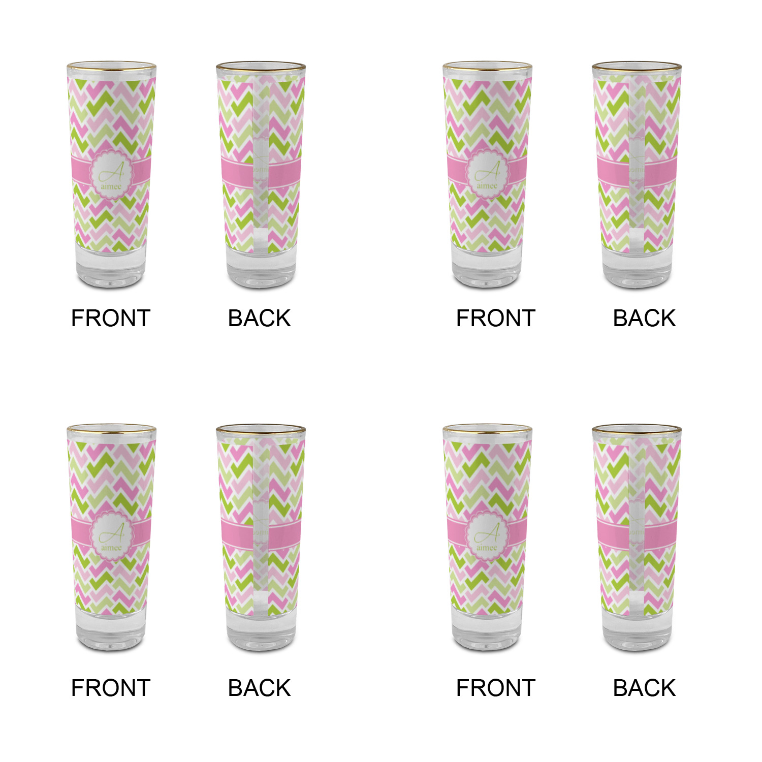 These glass shooter glasses are printed in full color with the design of your choice. These are a tall shooter 2 oz size and stand 4" tall. The print is a full wrap design to boldly display your personalization.