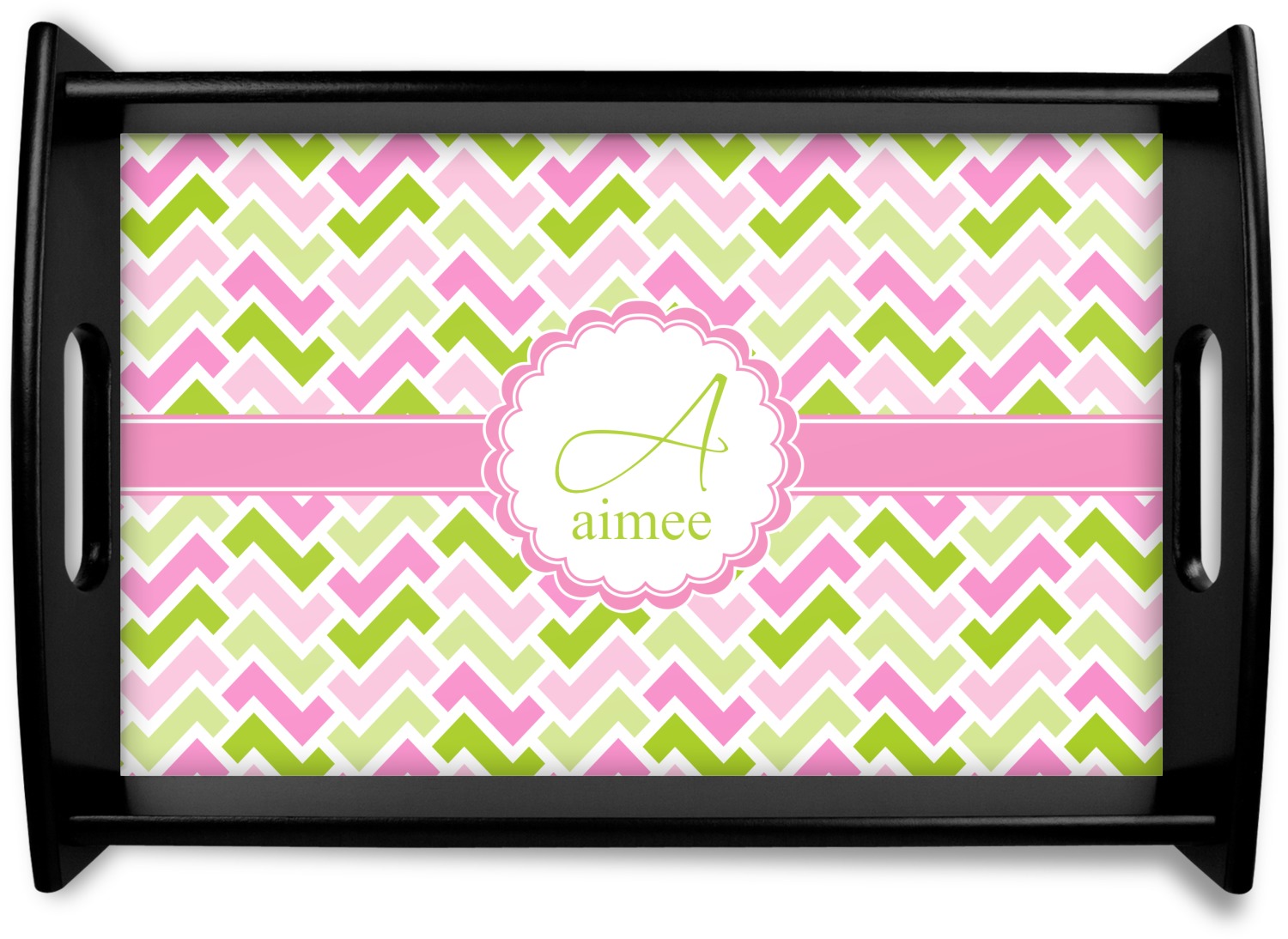 This serving tray with handles features square edges and two rounded sides, creating a very modern look. Each side is fabricated from a beautifully cut, natural wood. The bottom of the interior of the tray displays your customized design in bright, vibrant color. The tray is sold in both a black color and a natural wood look. Each variation of the wood serving tray has two sizes: Small, which is 14" x 10" x 2.25", and Large, which is 19.5" x 13.5" x 2.75".