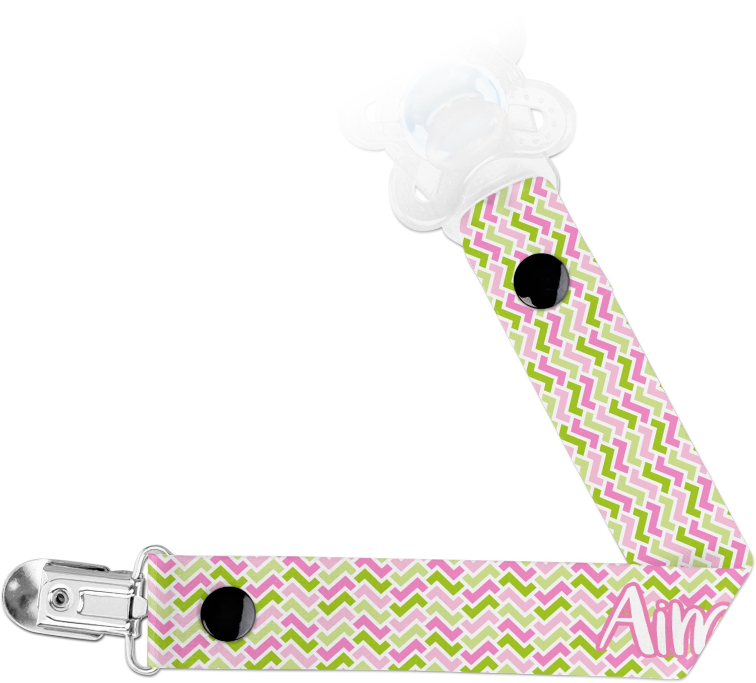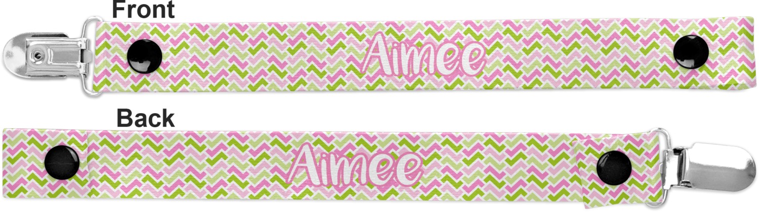 This personalized pacifier clip is the ideal size and measures at approximately 7.5 inches in length, when either end is snapped closed. On one end, you'll find a snap button. This button of your baby's pacifier holder is what can be attached to their pacifier to hold is securely in place. Simply open the snap, slip it through the pacifier opening, and snap it back into place. On the opposite end of this baby pacifier holder, you'll find a metal clip that can secure to a baby's collar or sleeve. This clip ensures that the strap stays in place, and that your baby's pacifier is always on hand.