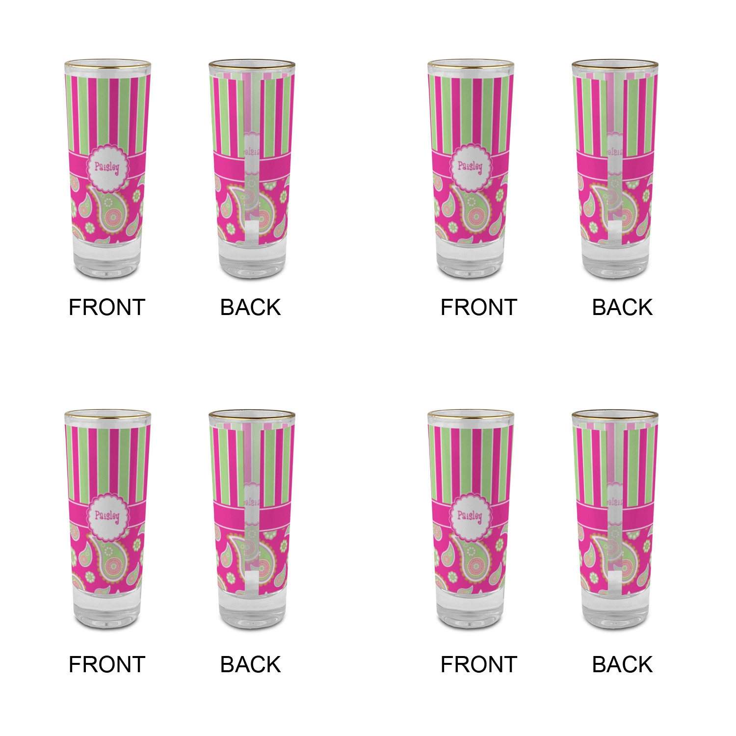 These glass shooter glasses are printed in full color with the design of your choice. These are a tall shooter 2 oz size and stand 4" tall. The print is a full wrap design to boldly display your personalization.