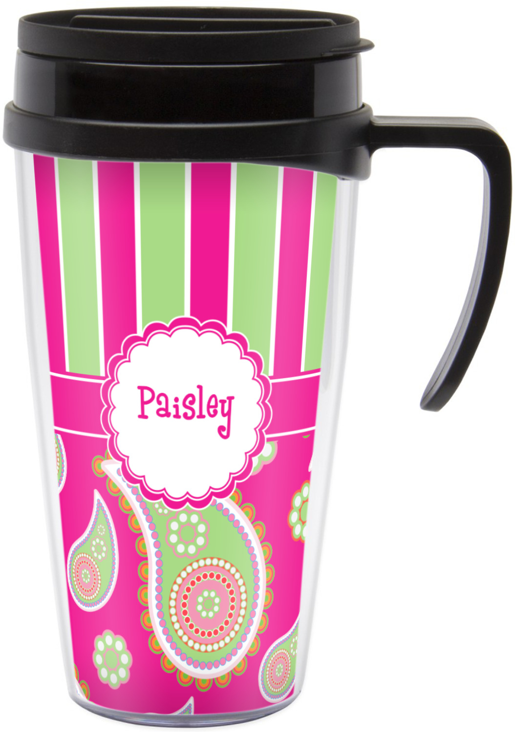 These thermal mugs are free of BPA, and insulated, to keep your drinks hot or cold. The black, snap on lid and the slider for sipping allows you to conveniently sip your drink without constantly worrying about a disastrous spill. We offer this mug with and without a handle, to better suit your needs. Each custom thermal mug holds up to 16 ounces of liquid and displays your customization on all sides on premium gloss media inserts.