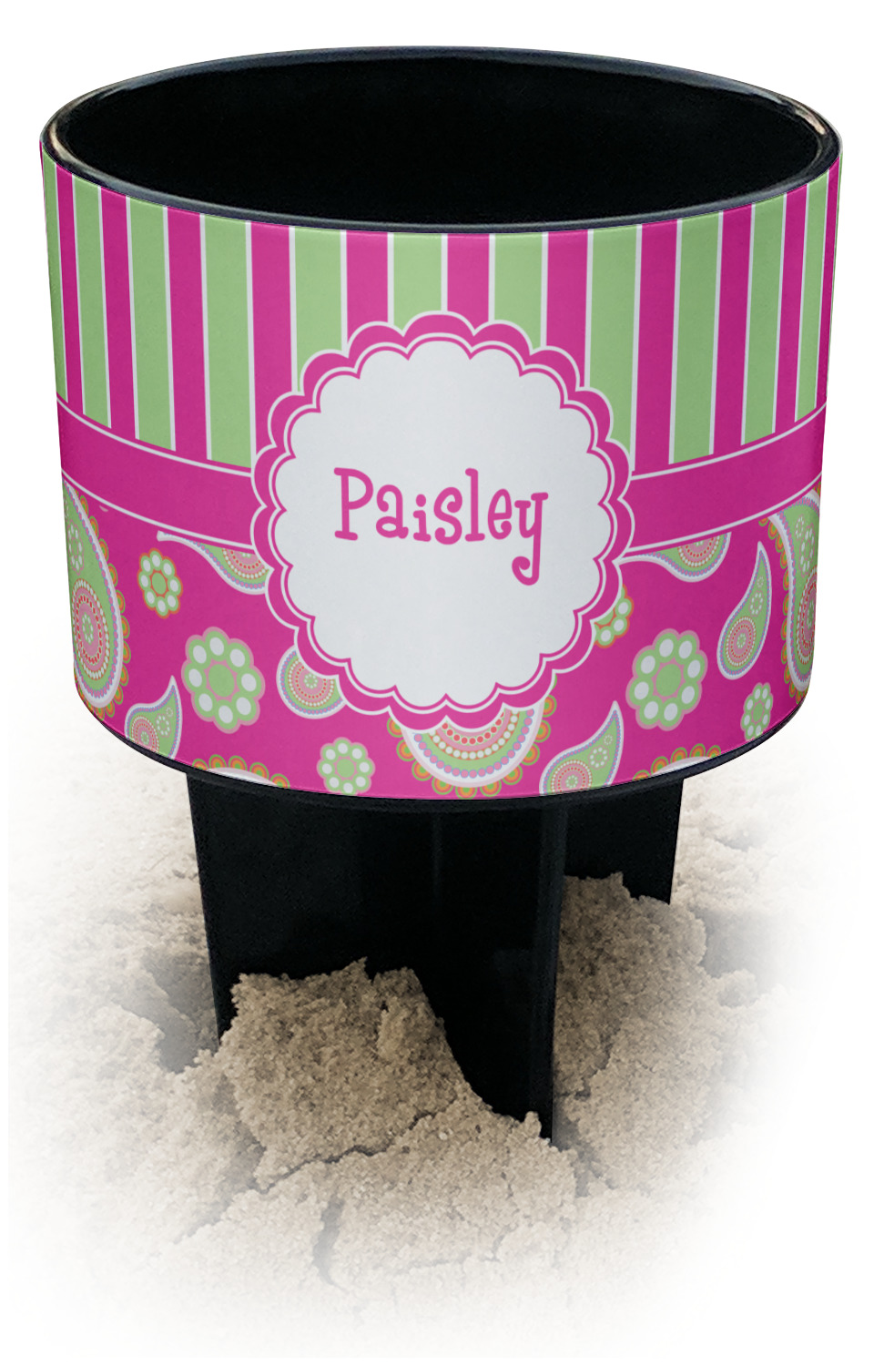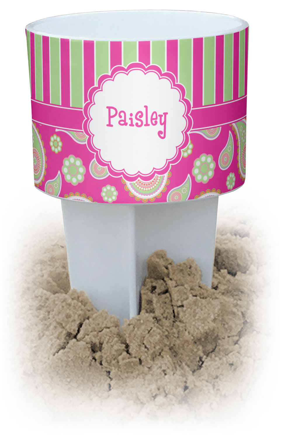 This cup holder has a large stake at its bottom that anchors it to the sand or ground below, while the cup holder rests above the stake. The entire drink holder is made of durable plastic and displays your customization around the cup holder portion. We sell these personalized beach spikers in two different colors: black and white.