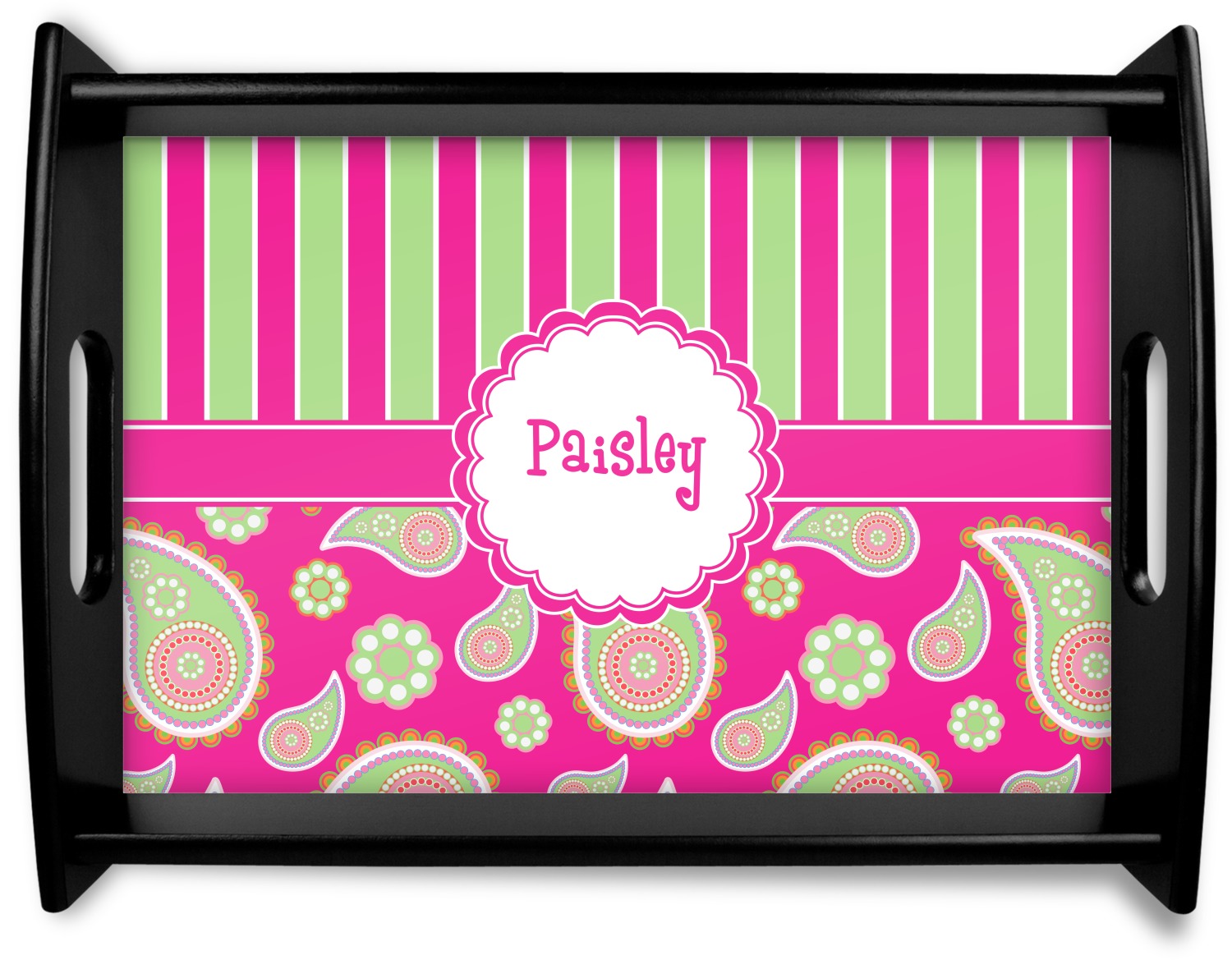 This serving tray with handles features square edges and two rounded sides, creating a very modern look. Each side is fabricated from a beautifully cut, natural wood. The bottom of the interior of the tray displays your customized design in bright, vibrant color. The tray is sold in both a black color and a natural wood look. Each variation of the wood serving tray has two sizes: Small, which is 14" x 10" x 2.25", and Large, which is 19.5" x 13.5" x 2.75".