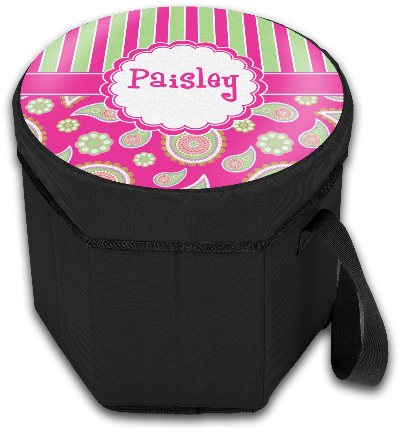 Our collapsible insulated coolers feature a unique six-sided hexagon shape, are lightweight, durable and can be turned into a seat. This cooler is fully insulated with silver foil lining to keep food and drinks hot or cold, and has a 12-quart capacity. Although this cooler collapses for easy transport, hidden inside are composition panels made of sturdy wood that give the frame strength and allow this cooler to be used as a seat. Simply sit down on the personalized cover and give your legs a break! (Maximum weight capacity of 200 pounds.)