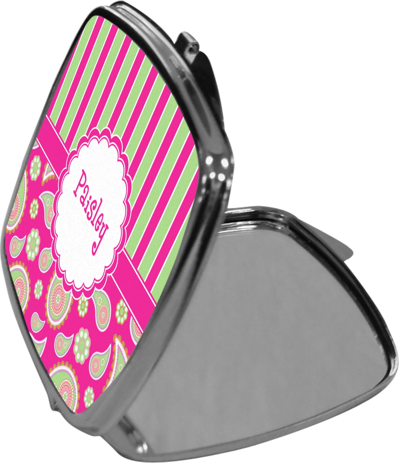 We offer many prints and patterns and many of our patterns are available in 45 different colors. You can personalized the compact mirrors with a name, a monogram or just an initial. We offer several different label, ribbon and font choices. Our customization system lets you create your very own custom & unique product and it lets you preview it before you purchase.