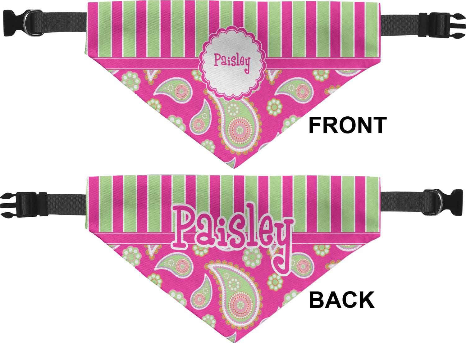 We print the front and back of these dog bandanas with your customized design. The bandana itself is made from a durable polyester, sewn together with a gap large enough to accommodate any collar. Regardless, the bandana includes a plain black, canvas collar with plastic snaps, that can easily be removed if desired. These dog bandana collars are available in four sizes: small, medium, large, and extra large. Please see our sizing chart for more information regarding the dimensions of each size.