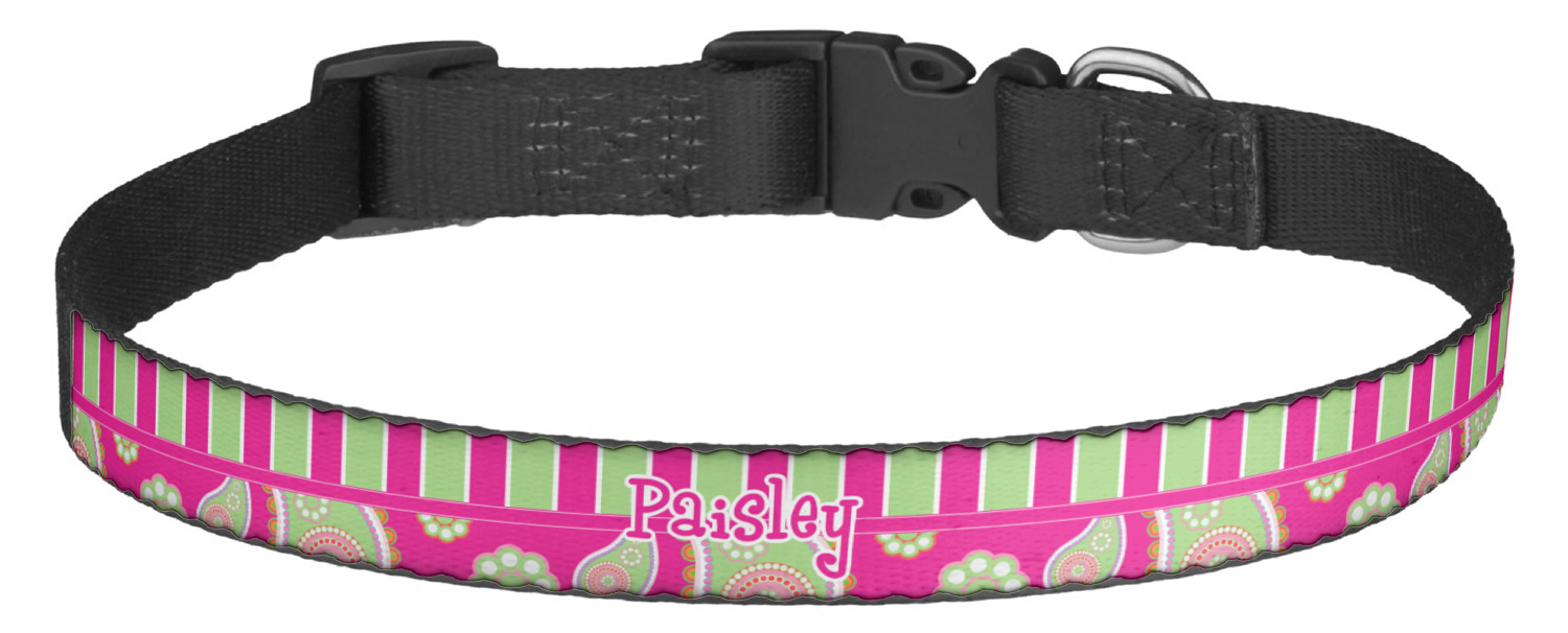 This sturdy collar, made from a durable nylon weave, will outlive your dog's episodes of excited tugging and pulling. Courtesy of its thick plastic buckle and adjuster, this collar is adjustable and accommodating of any dog. Structurally, the collar is a single piece of nylon weave that is sewn together, and features a solid metal loop where you can attach a leash or dog tag. We print and display your dog's name and pattern across the middle of the personalized dog collar.