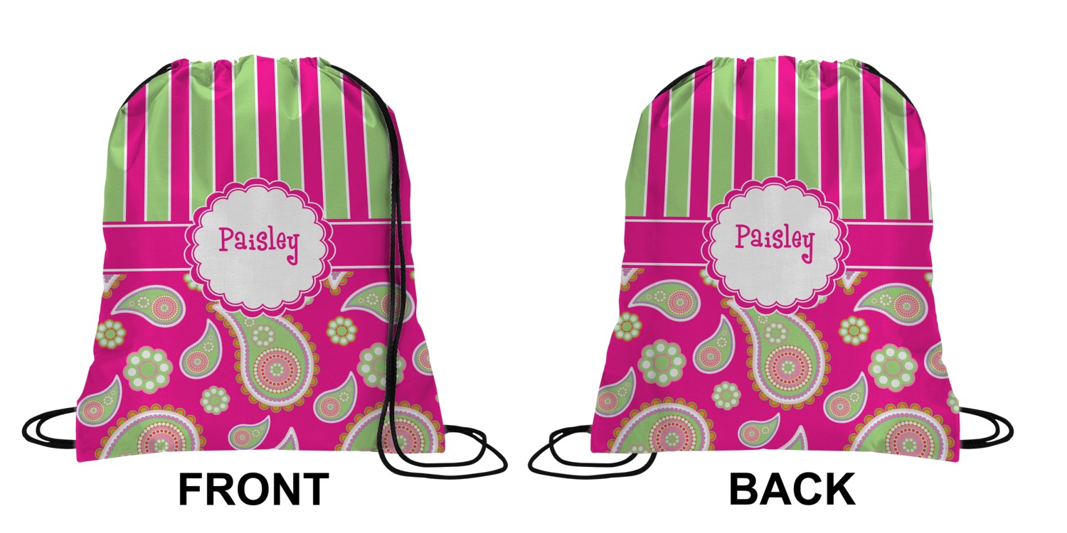 Our drawstring backpacks are custom made for you here in the USA. We offer a great selection of cinch bags and it is your choice to personalize them with the text of your choice, in the format of your choice i.e. monogram, name, initial, name & initial. We offer many different patterns and prints; and many of the patterns are available in 45 different colors.
