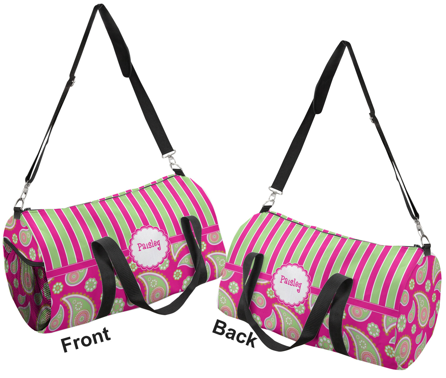 This duffle is a sturdy bag made of a canvas material. It comes in two sizes: Small (19"W x 9.5"H x 9.5"D) and Large (23"W x 12"H x 12"D). The bag is a cylindrical shape with a black adjustable strap and two handles. On one side is an elastic pouch to put a waterbottle or other small item. Your product will be sublimated with your design and is able to be designed on the front, back, and sides. Be sure to remember that the straps may cut into parts of your design if you upload your own artwork.