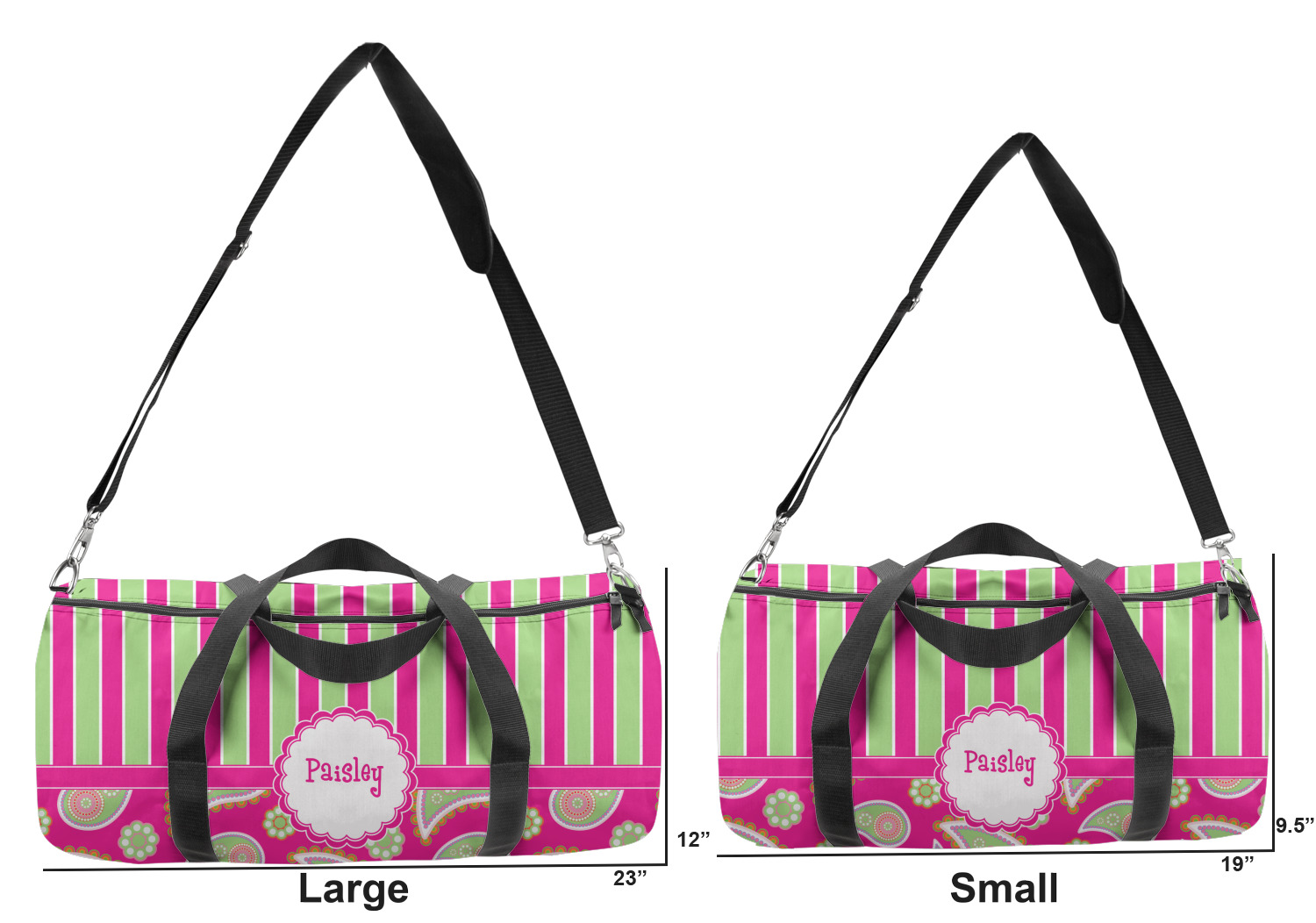 This duffle is a sturdy bag made of a canvas material. It comes in two sizes: Small (19"W x 9.5"H x 9.5"D) and Large (23"W x 12"H x 12"D). The bag is a cylindrical shape with a black adjustable strap and two handles. On one side is an elastic pouch to put a waterbottle or other small item. Your product will be sublimated with your design and is able to be designed on the front, back, and sides. Be sure to remember that the straps may cut into parts of your design if you upload your own artwork.