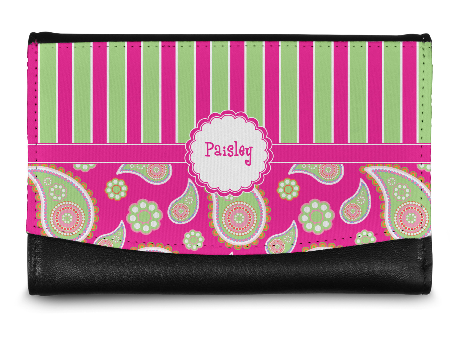The compact size of this wallet - 5.5in wide, 3.5in tall and 0.75in thick when folded - makes it perfect to hold in hand and small enough to fit in a clutch or a normal size purse. The outside flap is customized with your choice of artwork and closes with a snap closure - with two different snaps to allow it to be adjusted when storing more items - to securely fasten the flap.