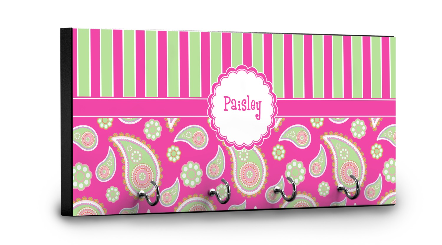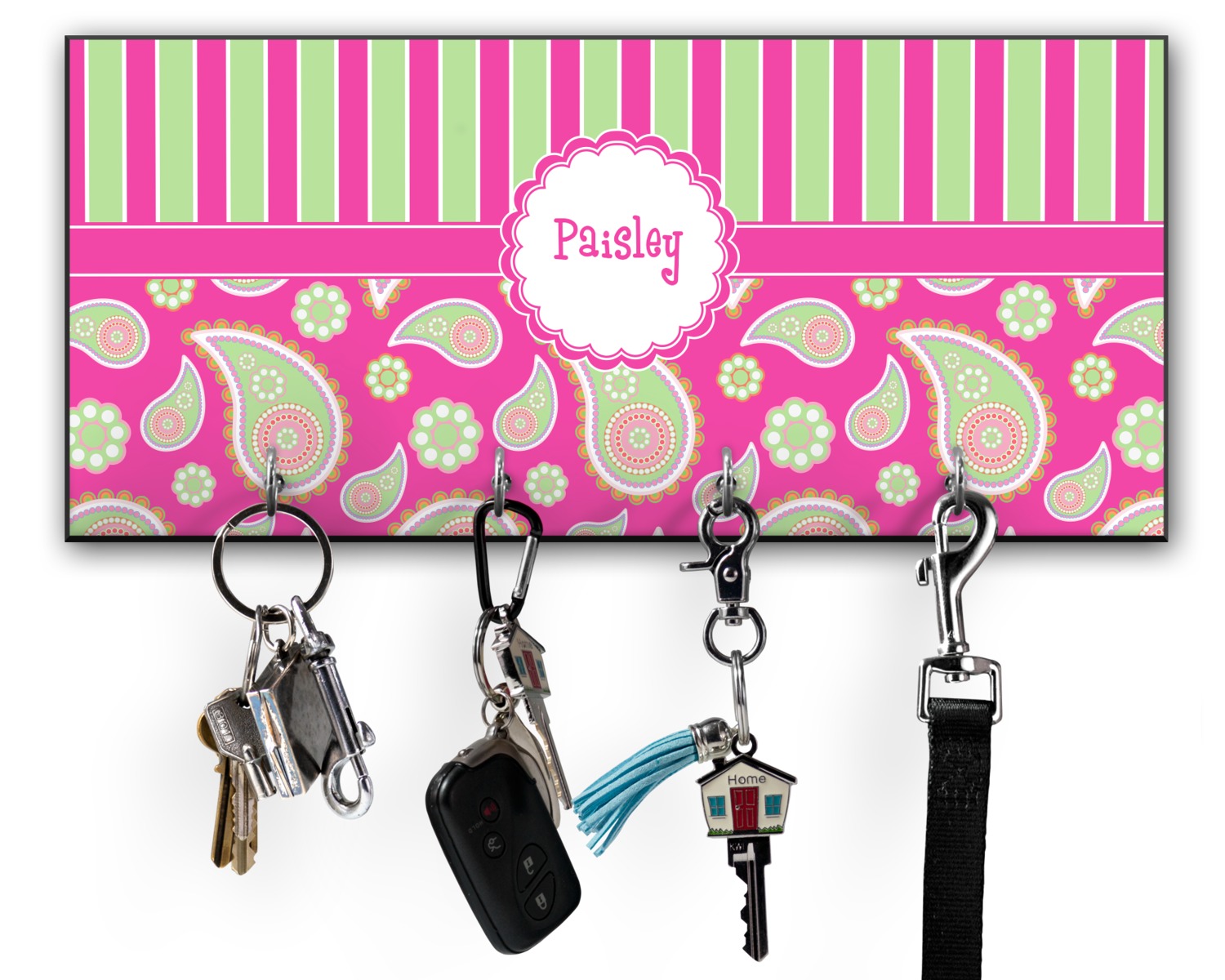 This 11" x 5" key hanger is made of sturdy wood and has four metal hooks lining the bottom. This is the perfect size for a family with several drivers. Not only can you hang keys on it though, but pet leashes and other small items. The board is black on the sides and back and is printed with the design of your choice on the front.
