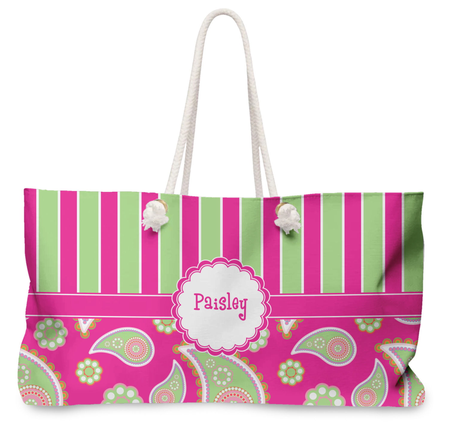 Our oversized weekender tote with rope handles is perfect for your weekend at the beach or on the town. This large tote are 24" W X 13" H, with a 5" gusset and a 27" thick rope handles with a knot that is put through a grommeted brass hole.