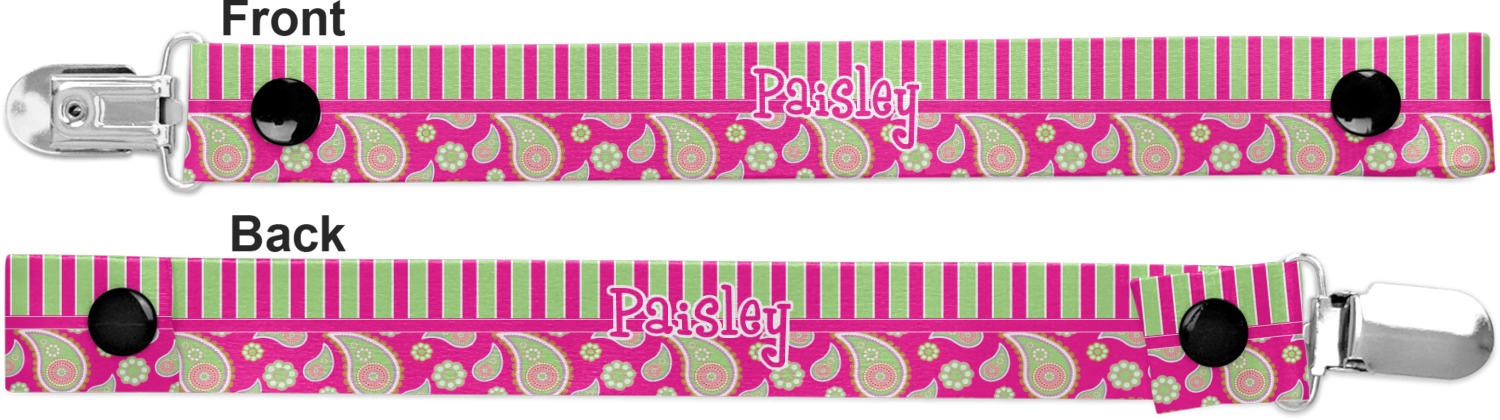 This personalized pacifier clip is the ideal size and measures at approximately 7.5 inches in length, when either end is snapped closed. On one end, you'll find a snap button. This button of your baby's pacifier holder is what can be attached to their pacifier to hold is securely in place. Simply open the snap, slip it through the pacifier opening, and snap it back into place. On the opposite end of this baby pacifier holder, you'll find a metal clip that can secure to a baby's collar or sleeve. This clip ensures that the strap stays in place, and that your baby's pacifier is always on hand.