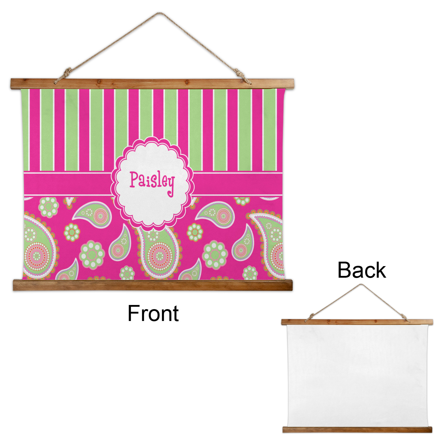 Made in two different orientations - portrait or landscape - both are 26" x 36". Your design is printed on a high quality polyester fabric with hemmed edges. The wood on the top and bottom of the tapestry is 1.25" tall and 0.25" thick and there are two pieces on top and bottom which sandwich the fabric.
