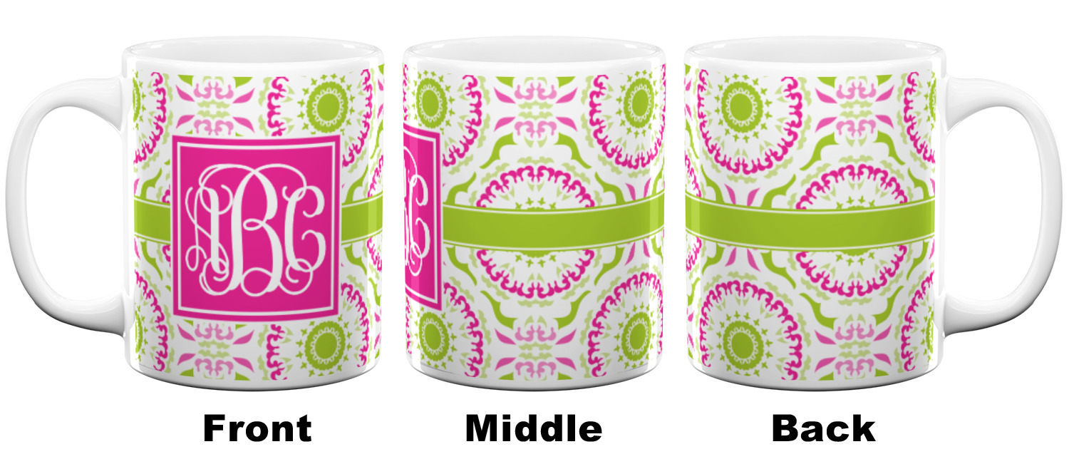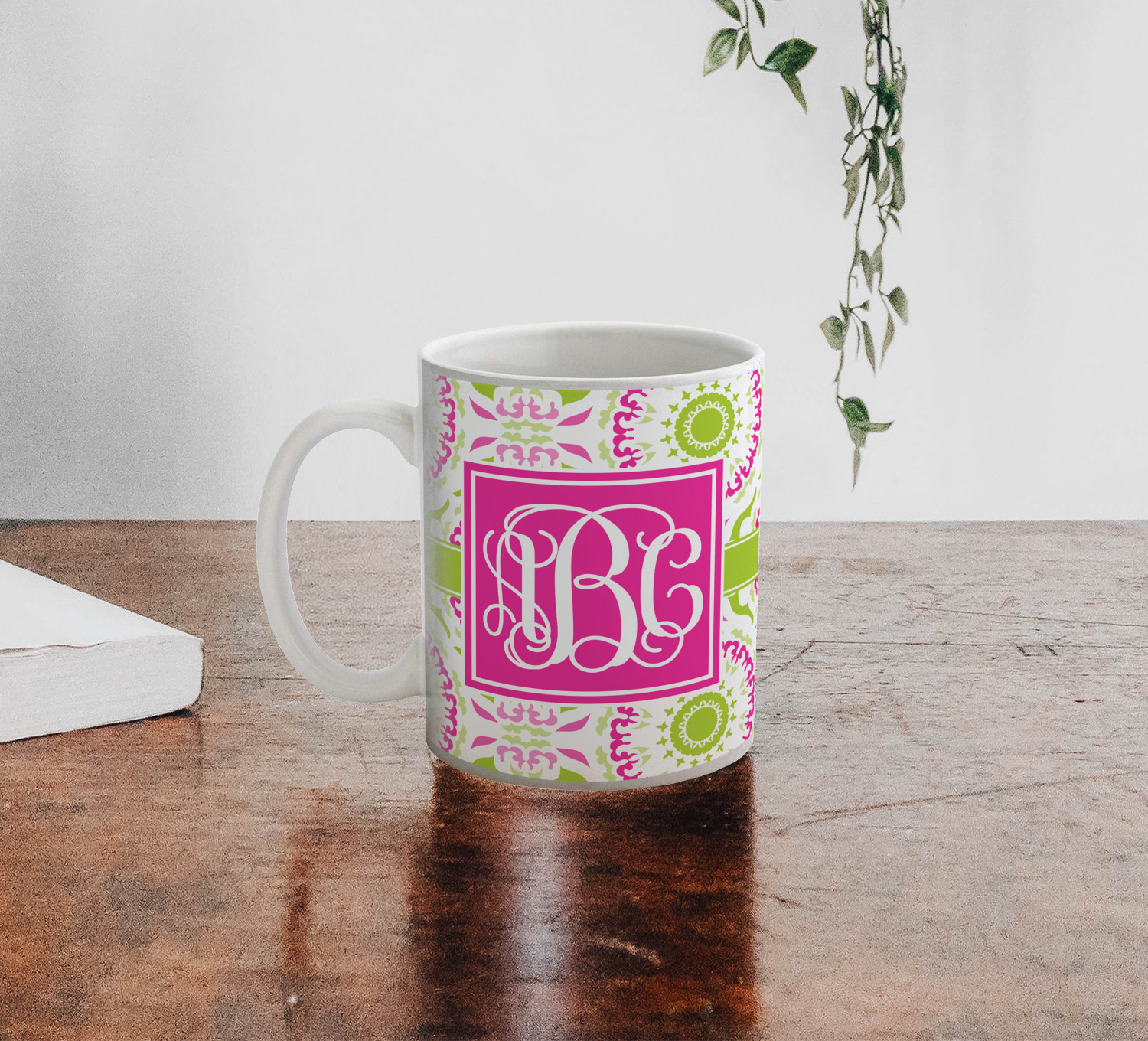 This design has a beautiful suzani floral pattern for the background. The colors in the background are white, hot pink, and lime green. These colors look super cute together. There is a lime green ribbon with a hot pink frame on top. Inside the frame is where your personalization goes. Put text or your initials for a monogram.