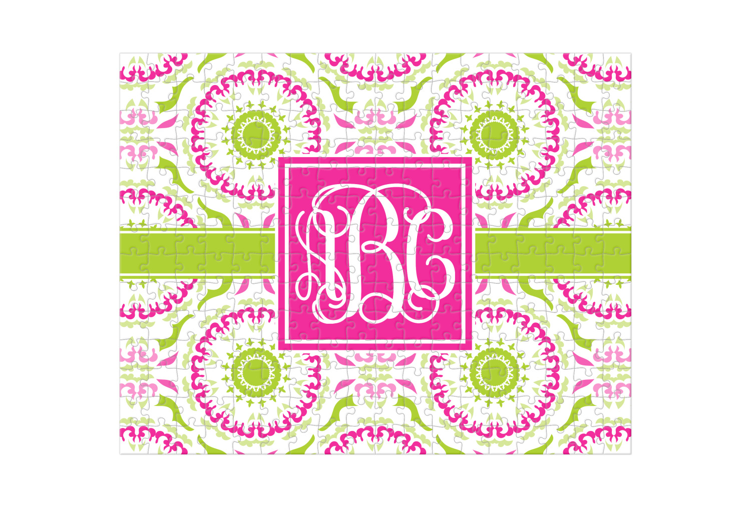 This design has a beautiful suzani floral pattern for the background. The colors in the background are white, hot pink, and lime green. These colors look super cute together. There is a lime green ribbon with a hot pink frame on top. Inside the frame is where your personalization goes. Put text or your initials for a monogram.