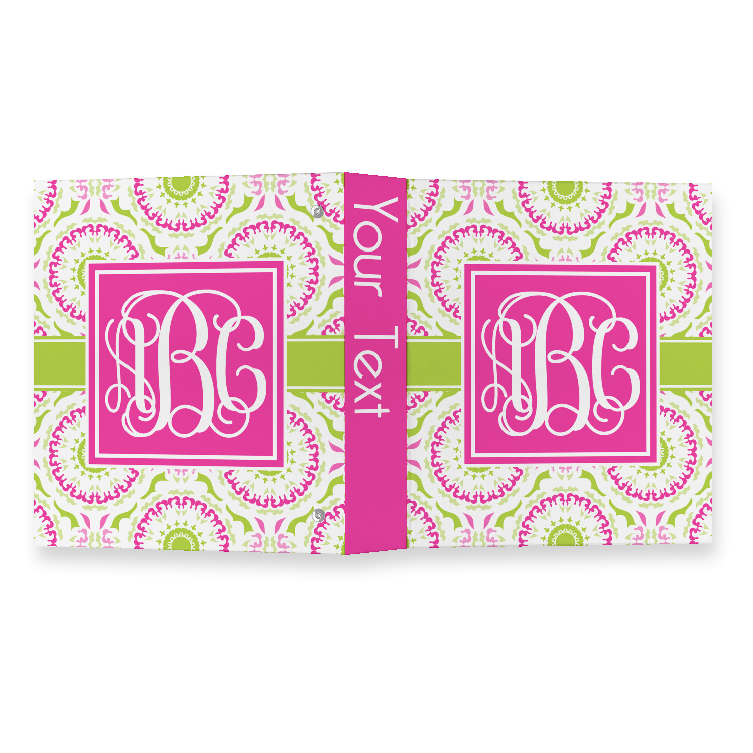 This design has a beautiful suzani floral pattern for the background. The colors in the background are white, hot pink, and lime green. These colors look super cute together. There is a lime green ribbon with a hot pink frame on top. Inside the frame is where your personalization goes. Put text or your initials for a monogram.