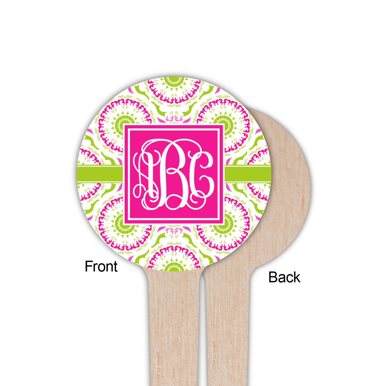 This design has a beautiful suzani floral pattern for the background. The colors in the background are white, hot pink, and lime green. These colors look super cute together. There is a lime green ribbon with a hot pink frame on top. Inside the frame is where your personalization goes. Put text or your initials for a monogram.