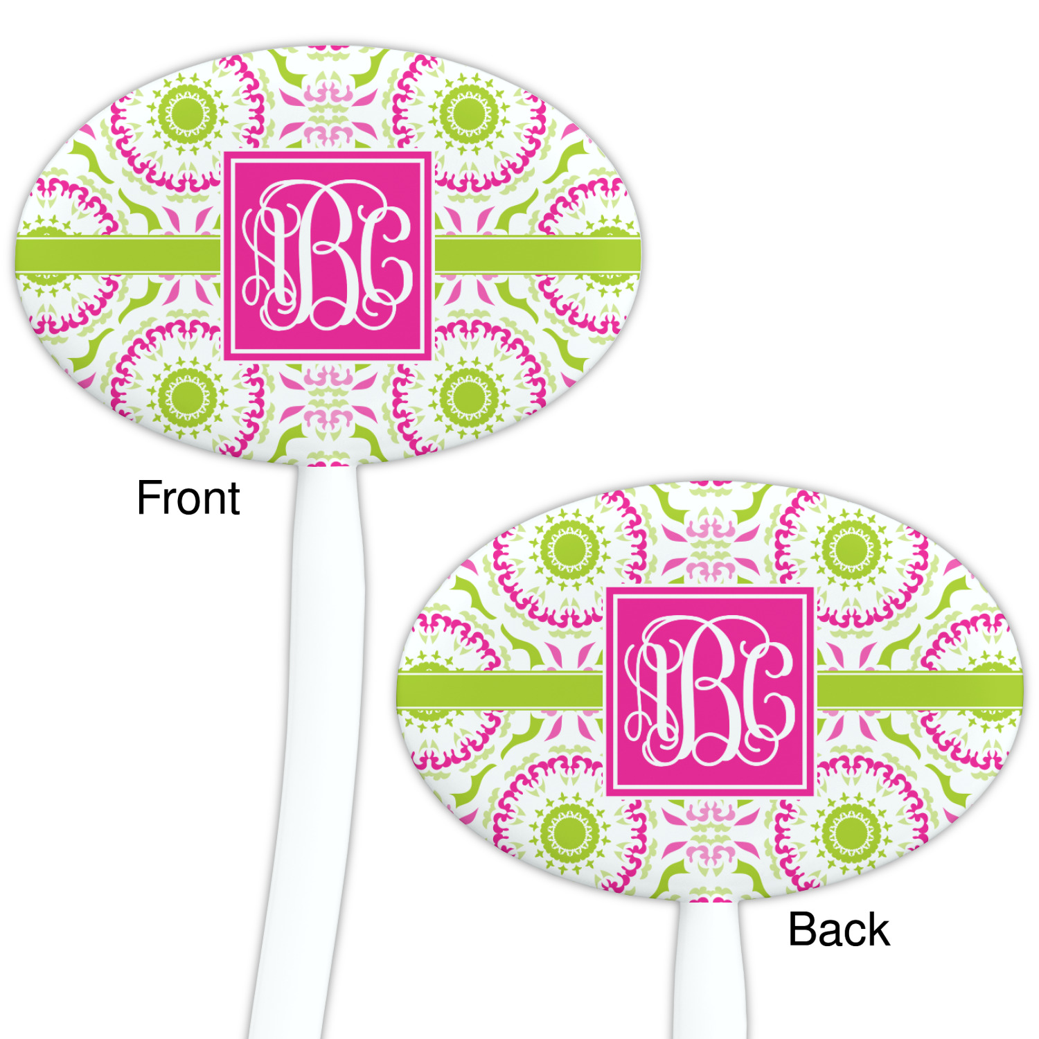 This design has a beautiful suzani floral pattern for the background. The colors in the background are white, hot pink, and lime green. These colors look super cute together. There is a lime green ribbon with a hot pink frame on top. Inside the frame is where your personalization goes. Put text or your initials for a monogram.
