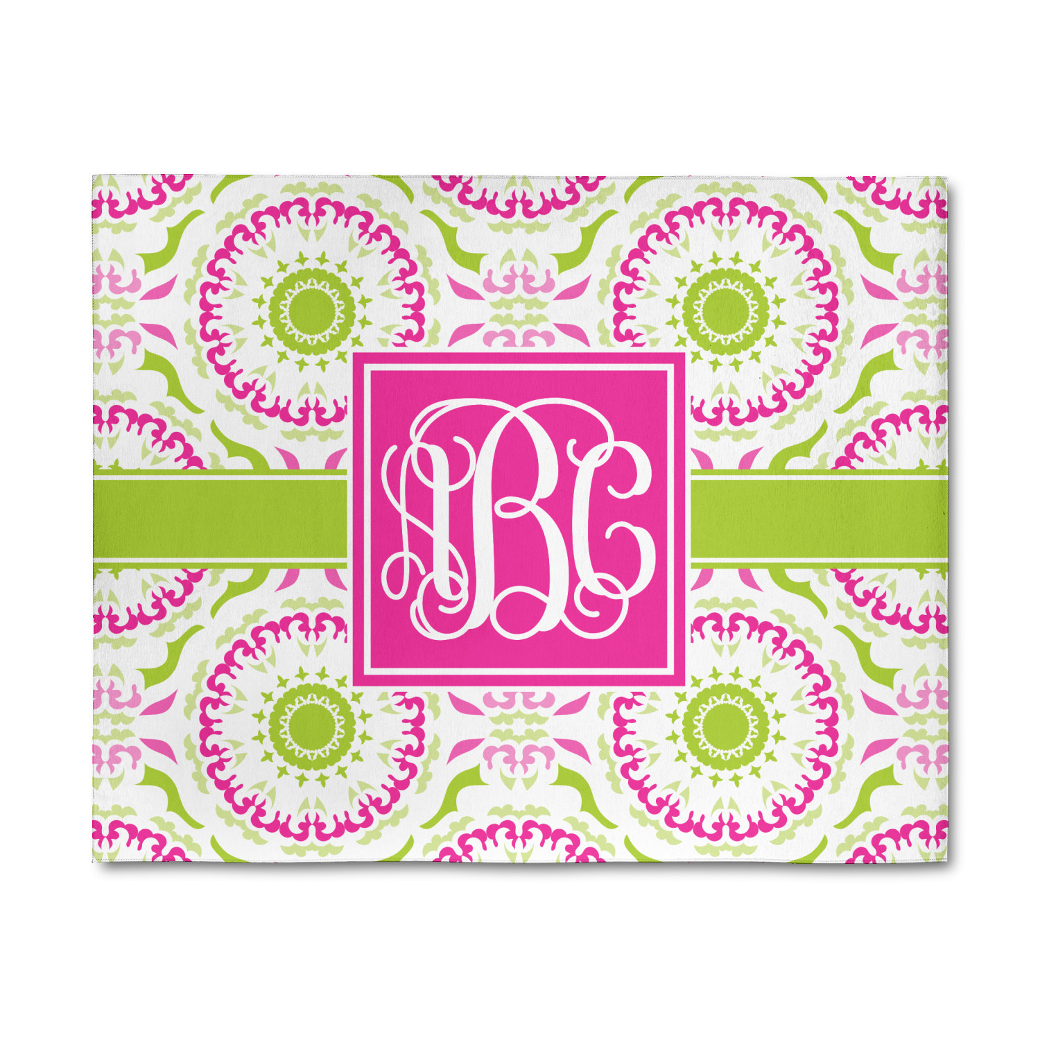 This design has a beautiful suzani floral pattern for the background. The colors in the background are white, hot pink, and lime green. These colors look super cute together. There is a lime green ribbon with a hot pink frame on top. Inside the frame is where your personalization goes. Put text or your initials for a monogram.