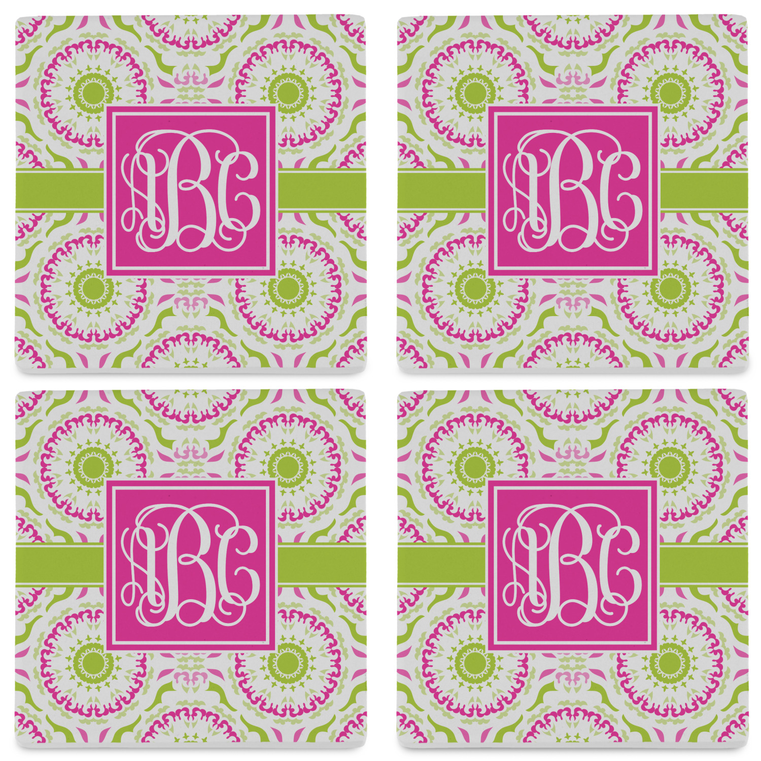 This design has a beautiful suzani floral pattern for the background. The colors in the background are white, hot pink, and lime green. These colors look super cute together. There is a lime green ribbon with a hot pink frame on top. Inside the frame is where your personalization goes. Put text or your initials for a monogram.