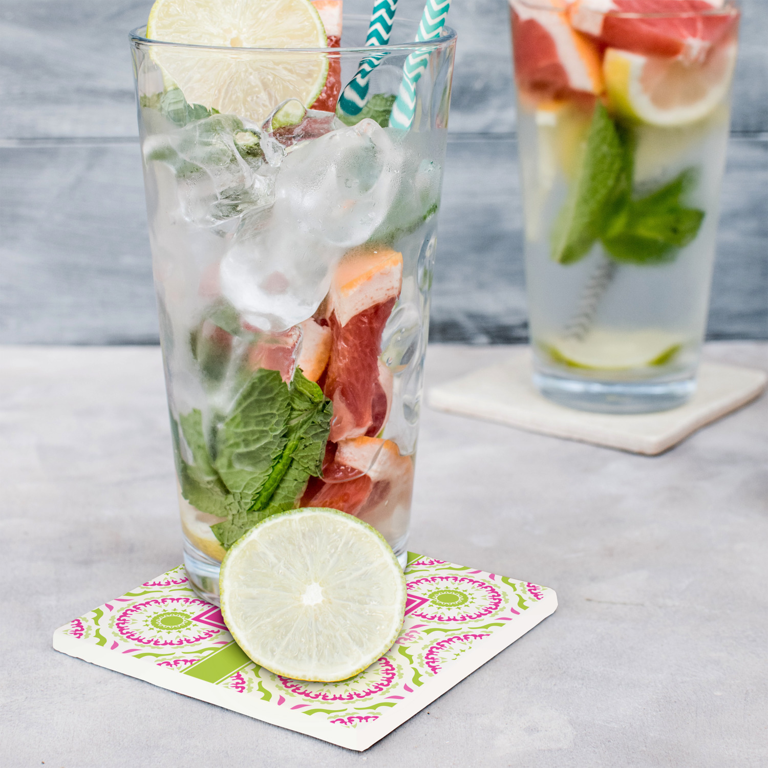These customized stone coasters are perfect for use with beverages that are served in drinkware that "sweat". When cocktails, sodas, iced tea, water, etc. are served with ice in a regular glasses (non insulated glasses), they release condensation that drips down the outside of the glasses.