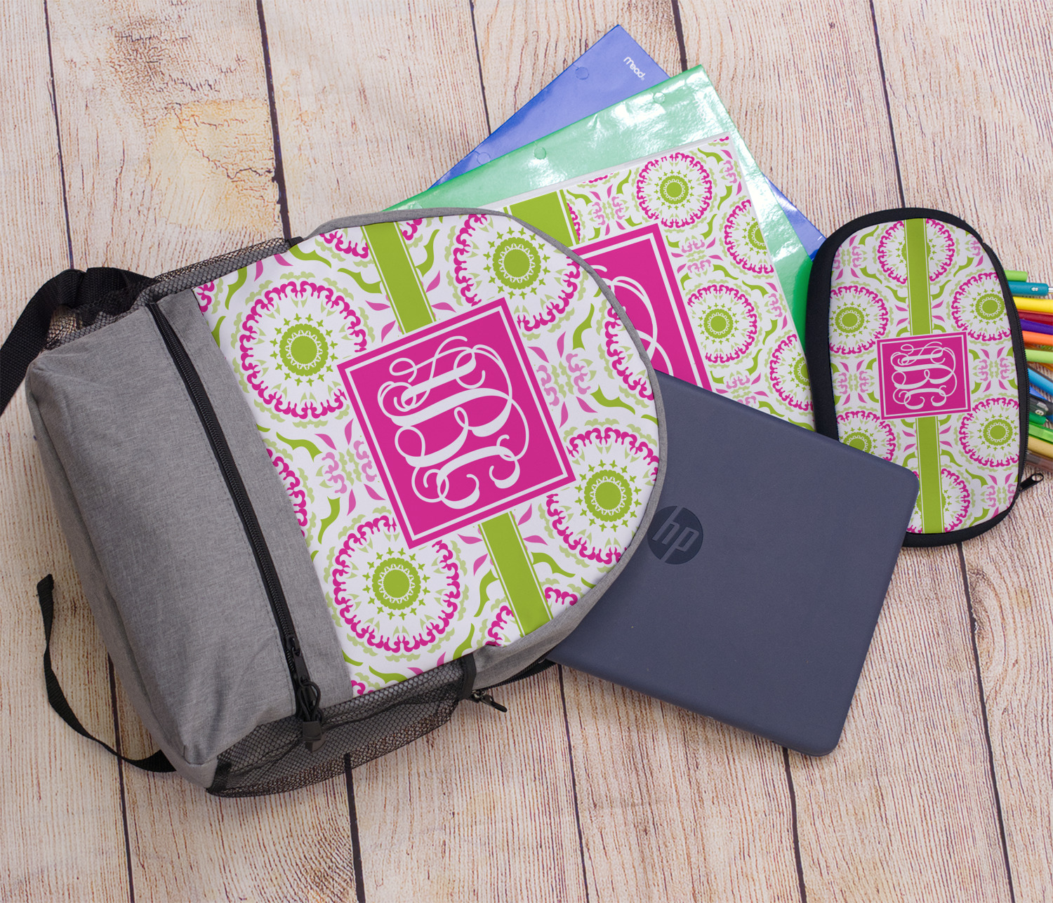 This design has a beautiful suzani floral pattern for the background. The colors in the background are white, hot pink, and lime green. These colors look super cute together. There is a lime green ribbon with a hot pink frame on top. Inside the frame is where your personalization goes. Put text or your initials for a monogram.