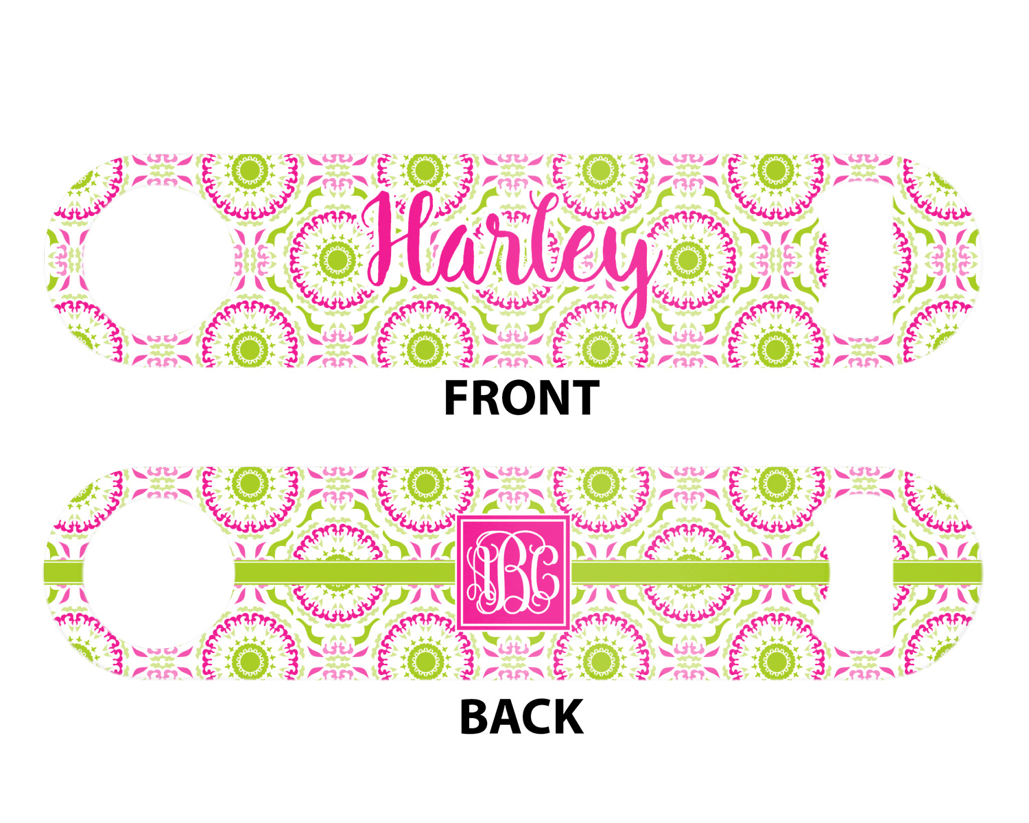 This design has a beautiful suzani floral pattern for the background. The colors in the background are white, hot pink, and lime green. These colors look super cute together. There is a lime green ribbon with a hot pink frame on top. Inside the frame is where your personalization goes. Put text or your initials for a monogram.