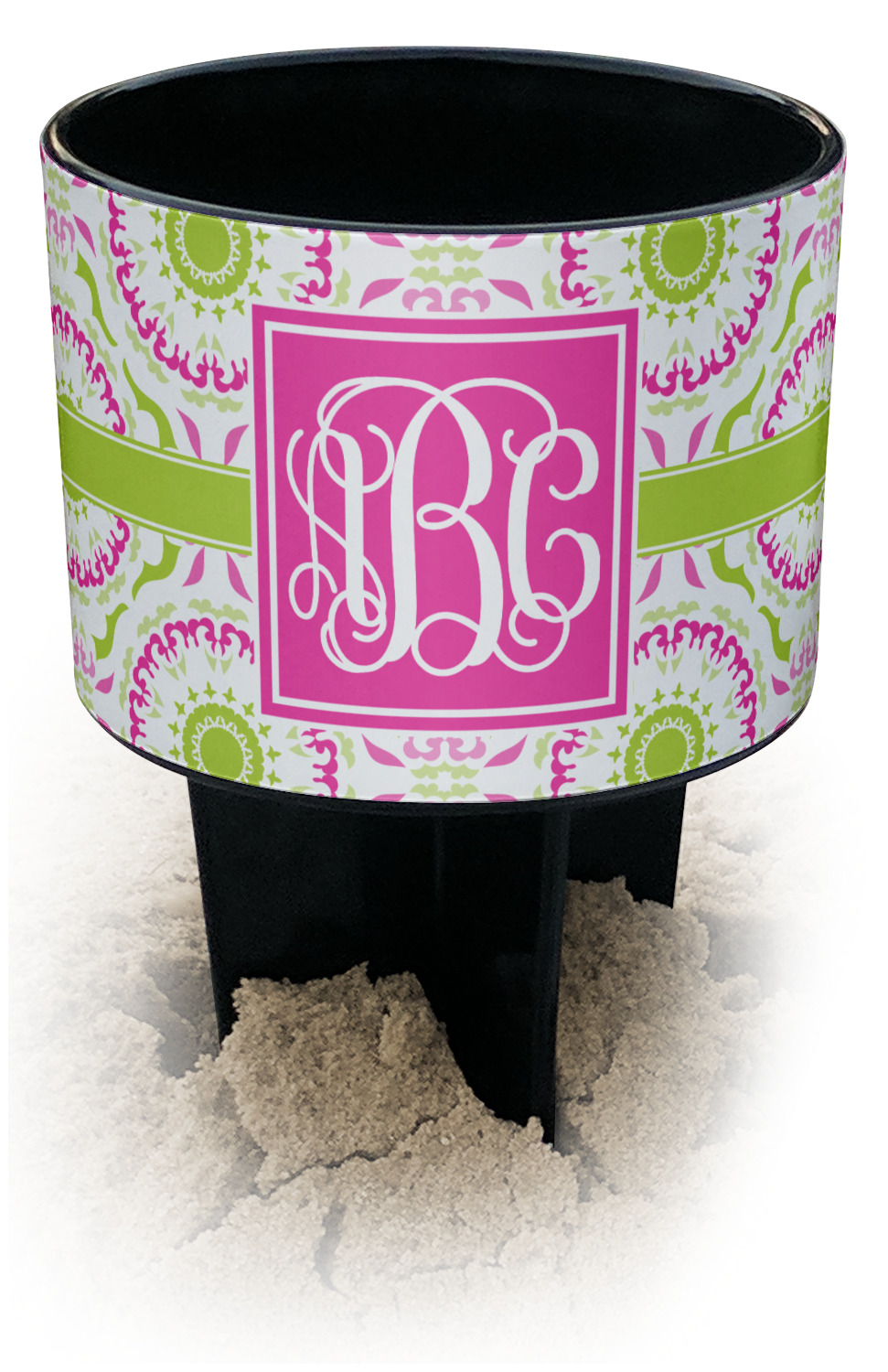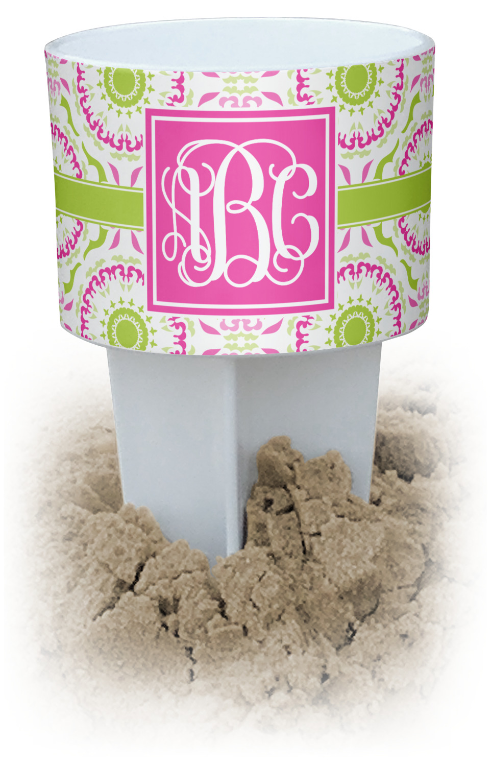 This cup holder has a large stake at its bottom that anchors it to the sand or ground below, while the cup holder rests above the stake. The entire drink holder is made of durable plastic and displays your customization around the cup holder portion. We sell these personalized beach spikers in two different colors: black and white.