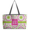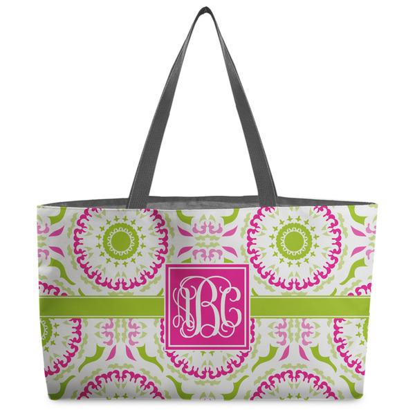 This design has a beautiful suzani floral pattern for the background. The colors in the background are white, hot pink, and lime green. These colors look super cute together. There is a lime green ribbon with a hot pink frame on top. Inside the frame is where your personalization goes. Put text or your initials for a monogram.