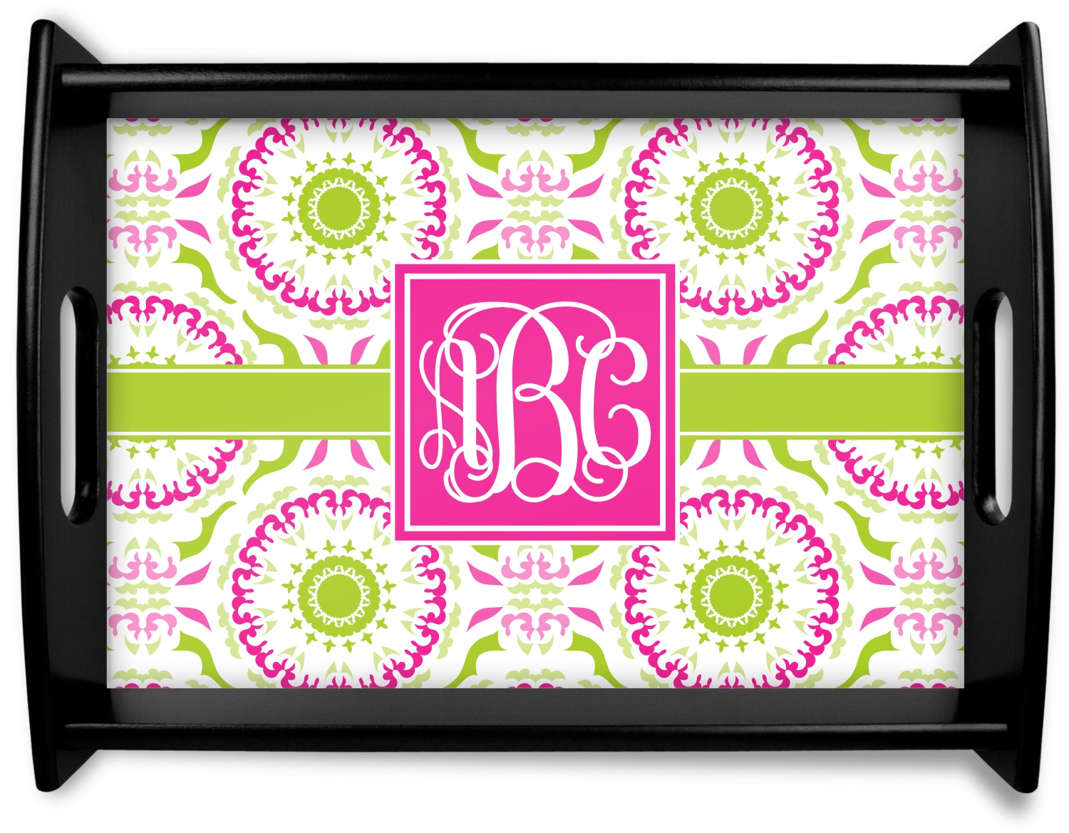 This design has a beautiful suzani floral pattern for the background. The colors in the background are white, hot pink, and lime green. These colors look super cute together. There is a lime green ribbon with a hot pink frame on top. Inside the frame is where your personalization goes. Put text or your initials for a monogram.
