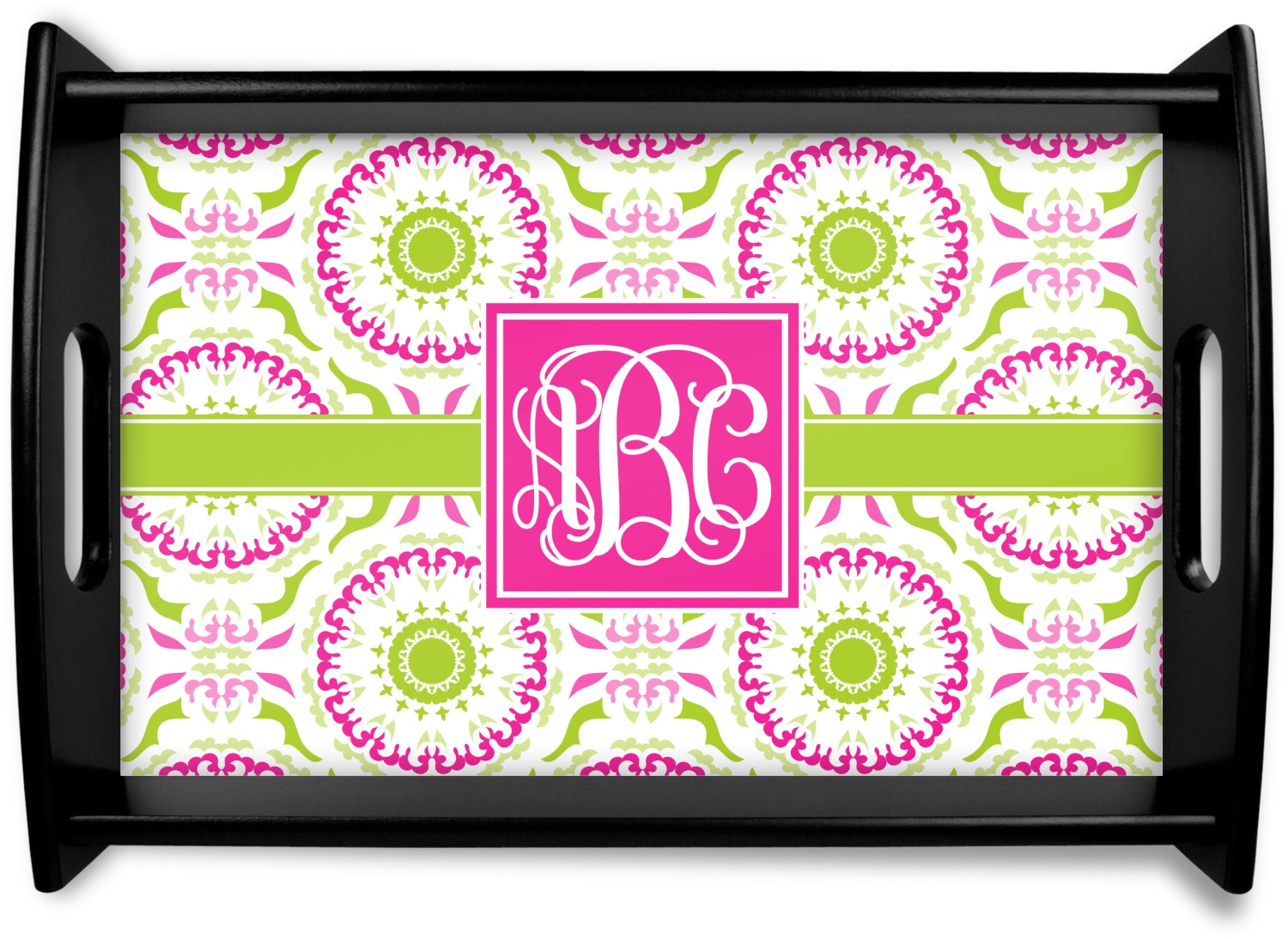 This design has a beautiful suzani floral pattern for the background. The colors in the background are white, hot pink, and lime green. These colors look super cute together. There is a lime green ribbon with a hot pink frame on top. Inside the frame is where your personalization goes. Put text or your initials for a monogram.