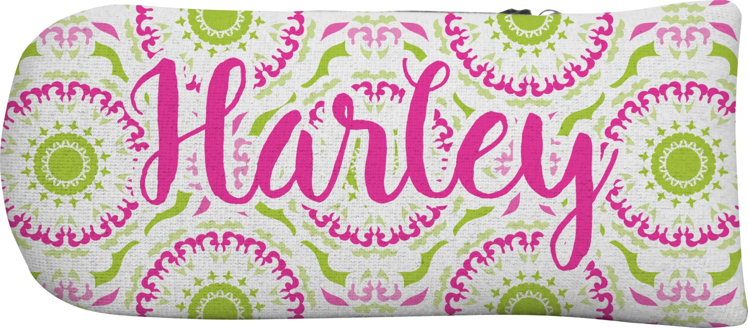 This design has a beautiful suzani floral pattern for the background. The colors in the background are white, hot pink, and lime green. These colors look super cute together. There is a lime green ribbon with a hot pink frame on top. Inside the frame is where your personalization goes. Put text or your initials for a monogram.