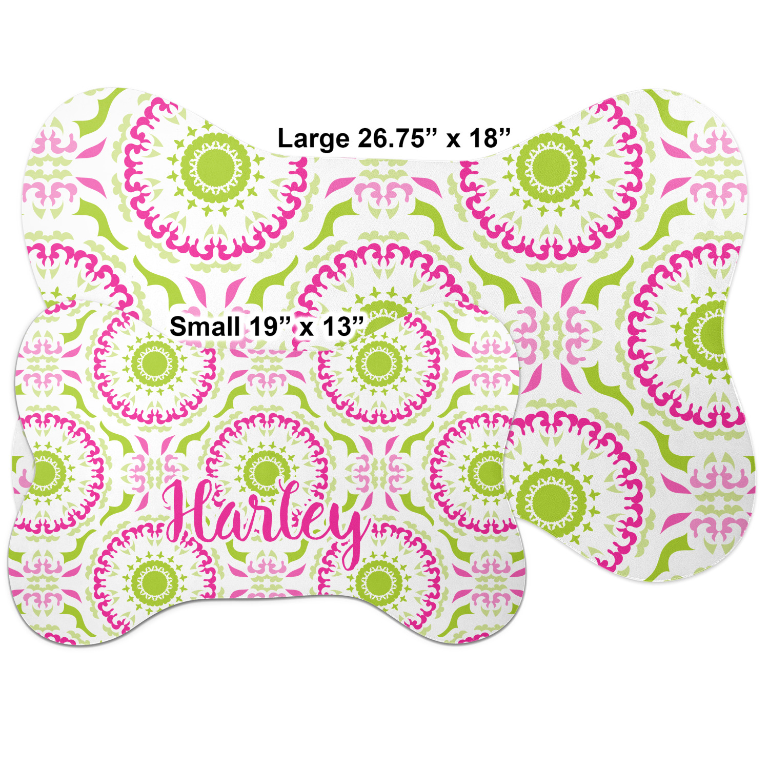 The top of this mat displays your custom design, as it is printed on polyester. To prevent slippage, the underside of the mat is made of rubber. We offer a small dog food mat, suitable for smaller dogs and a large dog food mat for bigger breeds. The small dog food mat is approximately 19 by 13 inches, while the large dog feeding mat measures at approximately 26.75 by 18 inches. Both personalized mats are ideally sized to fit two dog bowls.