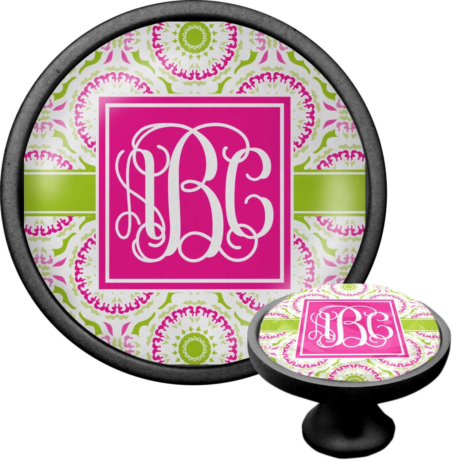 This design has a beautiful suzani floral pattern for the background. The colors in the background are white, hot pink, and lime green. These colors look super cute together. There is a lime green ribbon with a hot pink frame on top. Inside the frame is where your personalization goes. Put text or your initials for a monogram.
