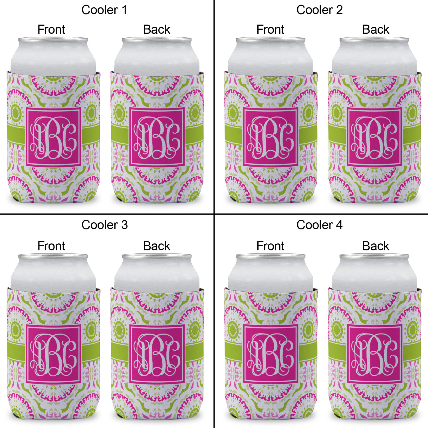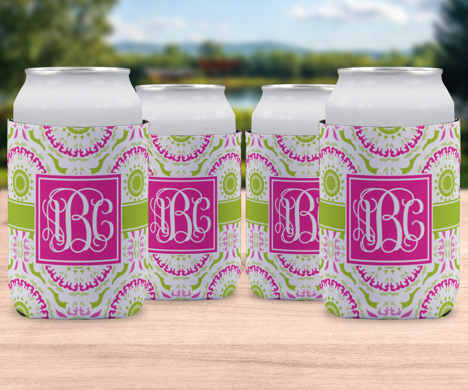 This design has a beautiful suzani floral pattern for the background. The colors in the background are white, hot pink, and lime green. These colors look super cute together. There is a lime green ribbon with a hot pink frame on top. Inside the frame is where your personalization goes. Put text or your initials for a monogram.