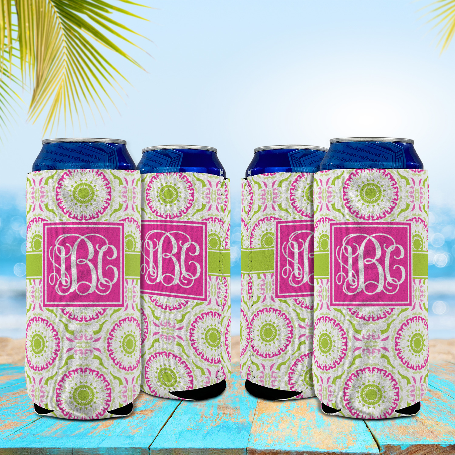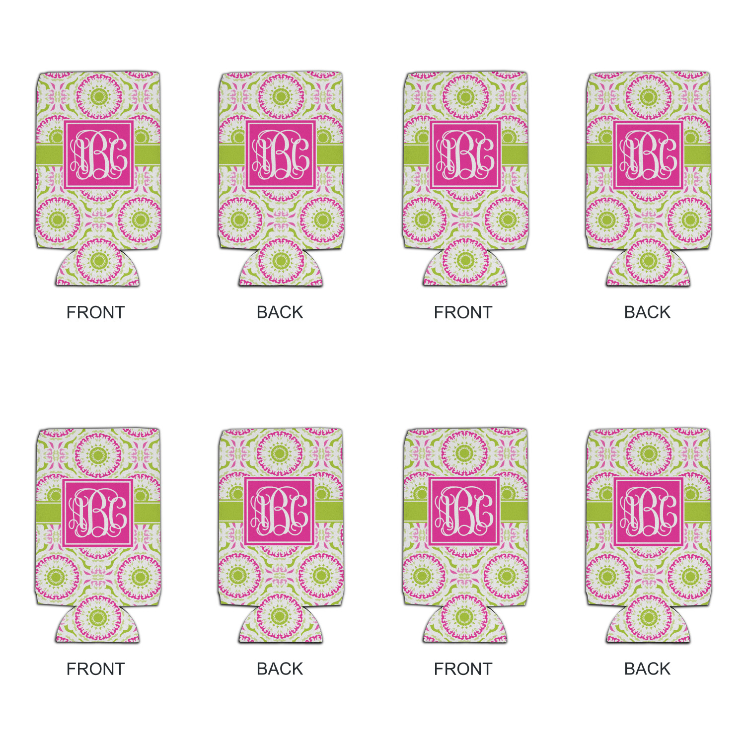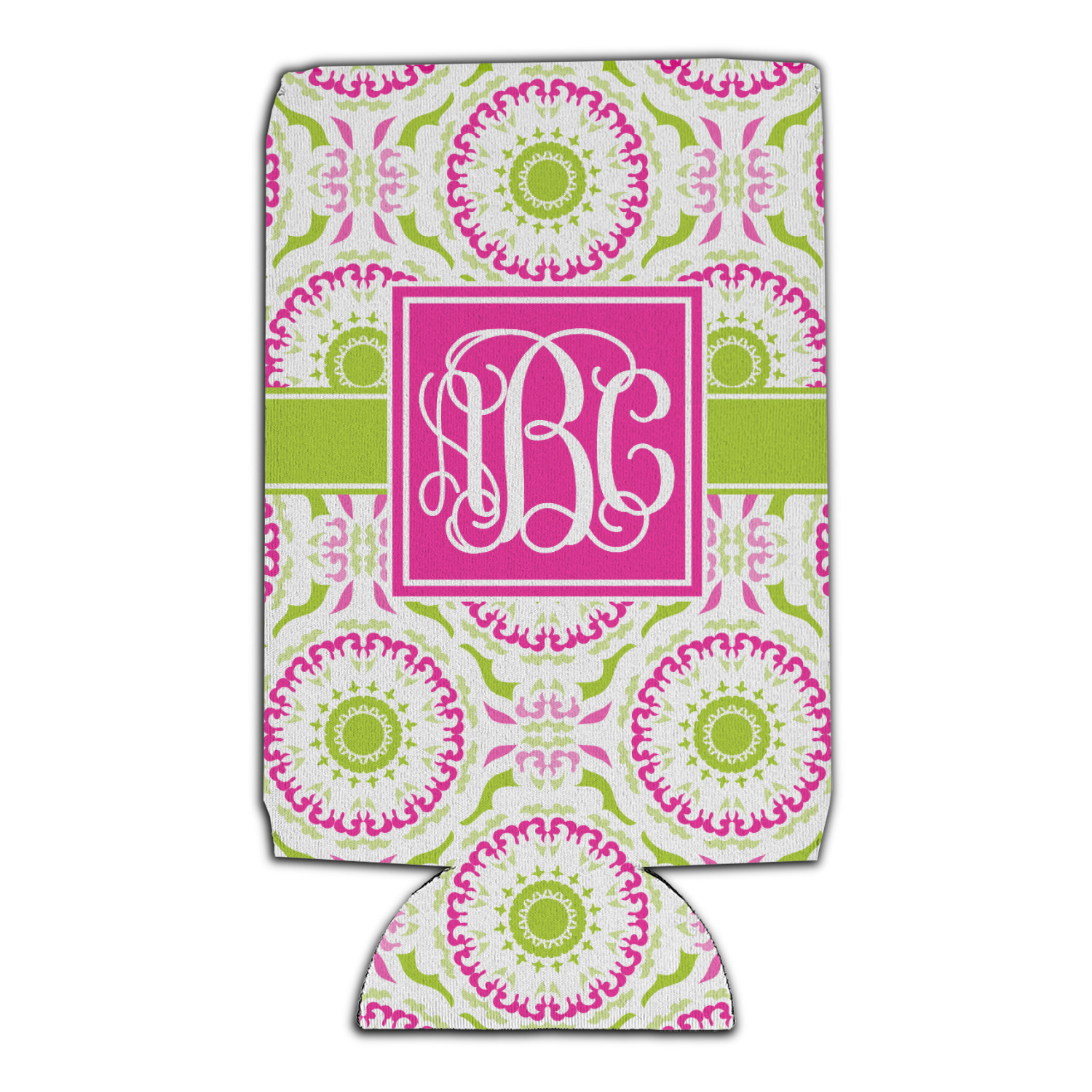This design has a beautiful suzani floral pattern for the background. The colors in the background are white, hot pink, and lime green. These colors look super cute together. There is a lime green ribbon with a hot pink frame on top. Inside the frame is where your personalization goes. Put text or your initials for a monogram.