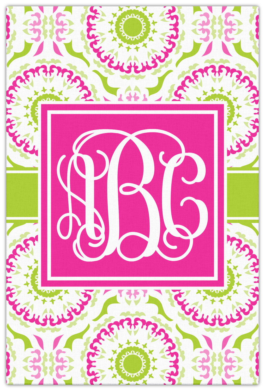 This design has a beautiful suzani floral pattern for the background. The colors in the background are white, hot pink, and lime green. These colors look super cute together. There is a lime green ribbon with a hot pink frame on top. Inside the frame is where your personalization goes. Put text or your initials for a monogram.