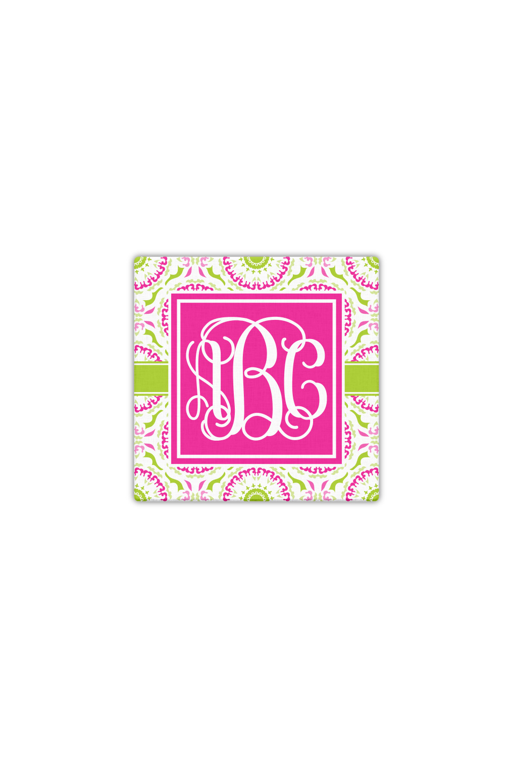 This design has a beautiful suzani floral pattern for the background. The colors in the background are white, hot pink, and lime green. These colors look super cute together. There is a lime green ribbon with a hot pink frame on top. Inside the frame is where your personalization goes. Put text or your initials for a monogram.